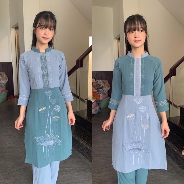 Đồ bộ đi chùa vải đủi vân may thêu hoa sen và chữ AN