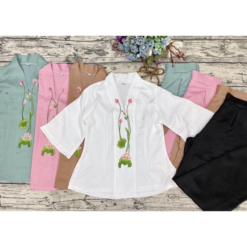 Quần áo đi chùa - Bộ thêu hoa 3D màu trắng - Tâm An Store