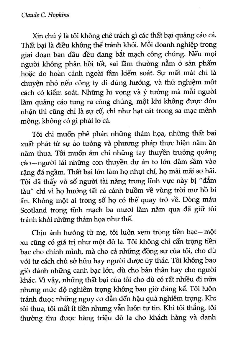 Quyển sách viết về những chiến dịch quảng cáo thực tiễn mà tác giả đã thực hiện cho các thương hiệu nổi tiếng như Palmolive, Pepsodent, Schlitz,… Đây là trải nghiệm thực tế nên không hề hàn lâm.