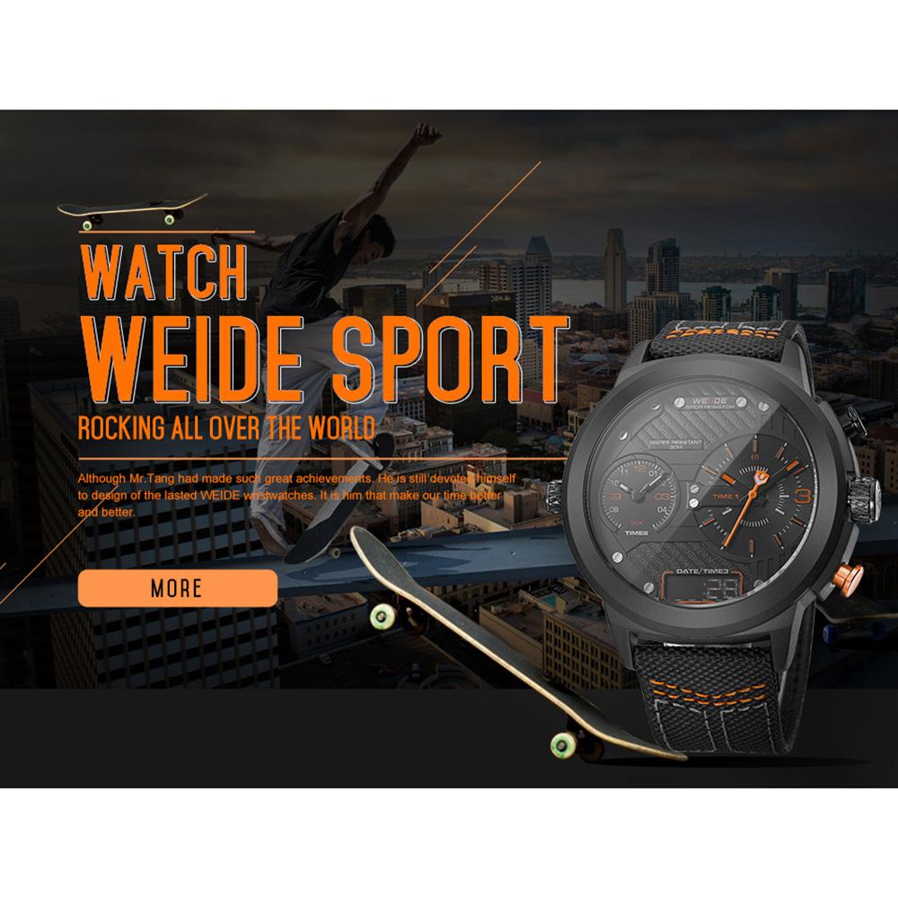 WEIDE WH1103 is a stylish sport watch with the function of auto date, alarm and stopwatch that certainly catches your heart! Features: With 12/24 Hours display, quartz and digital movements keeps good time. Attractive design