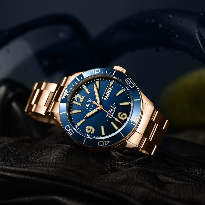 NAM TÍNH VÀ THỂ THAO Phiên bản đồng hồ lặn với vỏ viền bezel xanh nổi bật cùng các cọc số trắng kết hợp với dây kim loại mạ PVD vàng hồng thời thượng.