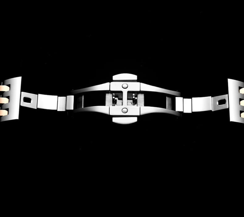 Đặc điểm kỹ thuật - - Vật liệu vỏ / gờ: Mạ ion - Chốt gập 3 chỉ với một lần bấm - Dây đeo bằng thép không gỉ - Mặt kính khoáng - Khả