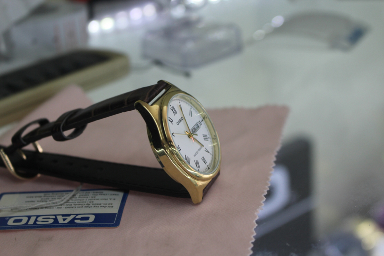 [cận cảnh đồng hồ] Casio MTP-V006GL-7BUDF viền vàng dây da, dây da sau 2 năm vẫn rất bền