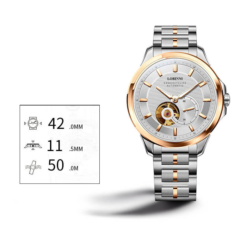 Đồng hồ nam chính hãng LOBINNI Thụy Sỹ Thiết kế sang trọng, đẳng cấp cho quý ông Thời gian trữ cót lâu lên đến 40h Chống nước 5ATM, Kính sapphire Toàn bộ máy được làm từ thép không gỉ 316L Đồng hồ cơ Automatic, Sử dụng bộ máy Miyota 8215 Chính hãng