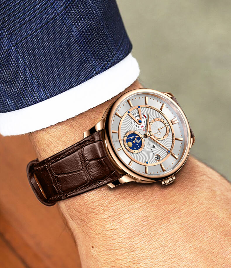 ♪ Sự pha trộn tinh tế đầy bất ngờ và xen lẫn giữa phong cách hiện đại, cổ điển là yếu tố làm nên sự hiện diện của phiên bản đồng hồ PONIGER P813-1 tại Việt Nam, dành riêng cho nam giới.
