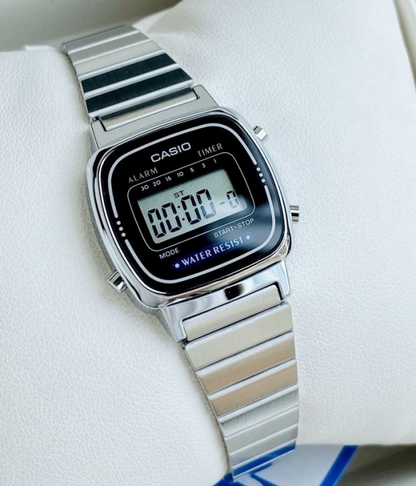 Thời trang cho phái đẹp với mẫu dây lưới Casio LA670WEM-7DF được phối tông màu bạc trẻ trung cùng với thiết kế bộ máy nhỏ gọn thanh mảnh với nền mặt số điện tử hiện