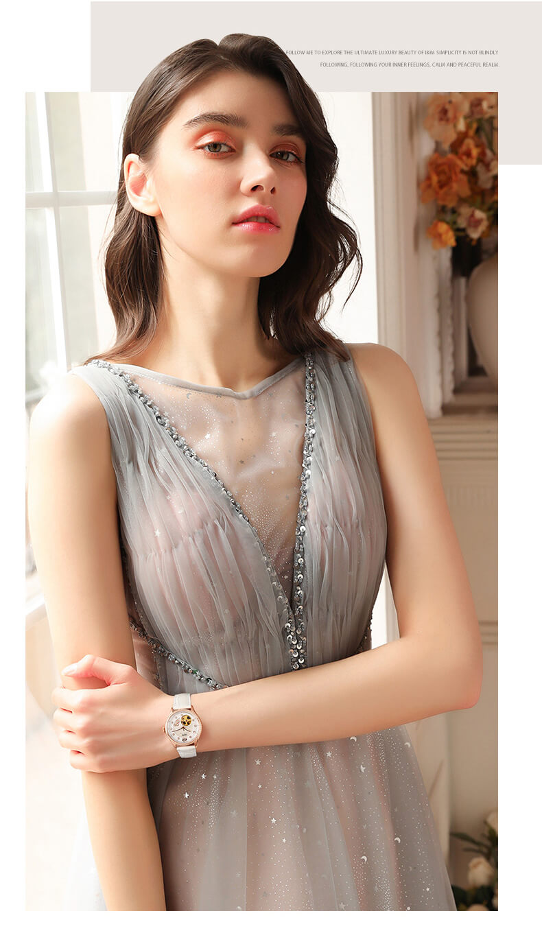 THÔNG SỐ SẢN PHẨM: Thương hiệu :Kassaw Mã sản phẩm : K990-2 Giới tính : Nữ Kiểu máy : Đồng hồ cơ (Automatic) Đường kính mặt : 33 mm Độ dày : 10 mm Chất liệu