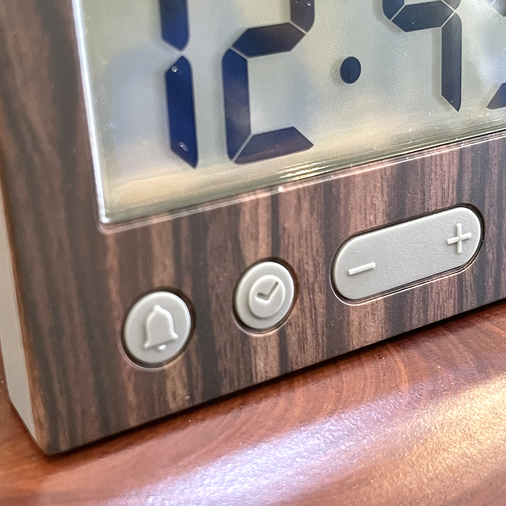 Mua tại TiktokĐồng hồ để bàn báo thức Rhythm LCT108NR06 – Kích thước 13.1 x 6.6 x 3.6cm, trọng lượng 150g. Vỏ nhựa vân gỗ. Dùng 2 Pin tiểu ( AA x 2). Màn hình tinh thể lỏng LCD tự động bật sáng trong tối ( màu cam nhạt – Auto Light On In The Dark). Hiển thị ngày, thứ, tháng bằng 8 thứ tiếng ( Anh , Đức, Pháp, Italy, Tây Ban Nha, Đan Mạch, Nga, ), Nhiệt độ , độ ẩm môi trường. Báo thức 4 cấp độ âm lượng tăng dần. Báo thức lập lại ( Snooze) chống ngủ nướng. Có đèn Led xem giờ trong tối bằng cảm ứng chạm mặt kính đồng hồ. ( Touch Sensor )