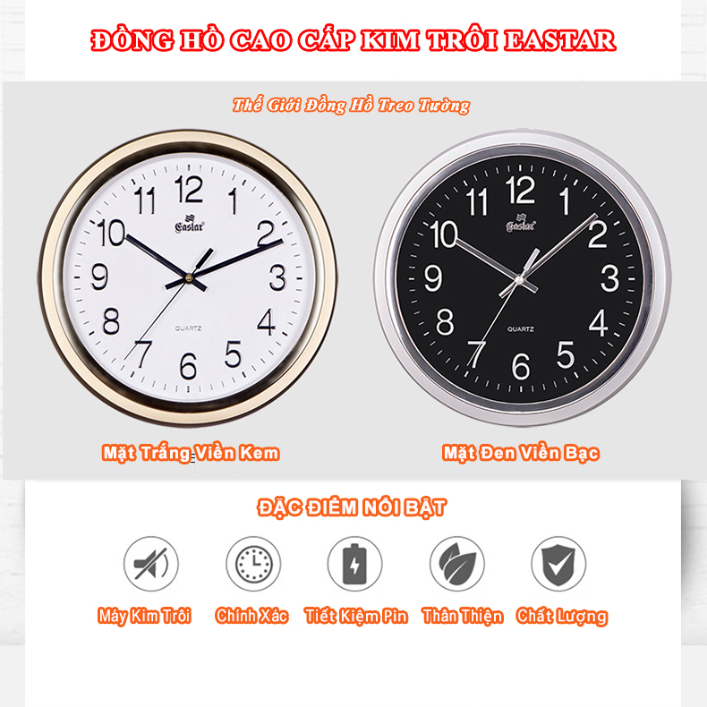 1. ĐẶC ĐIỂM NỔI BẬT: - Đồng hồ Treo tường Cao Cấp EASTAR có Dạ quang (*), máy đồng hồ Kim Trôi mặt tròn  đường kính 34 cm, dày 4,5 cm. - Thiết kế hiện