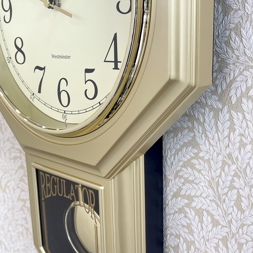 Đồng hồ treo tường Nhật Bản Rhythm CMG876NR18, dùng pin (AA x 1), vỏ nhựa màu vàng / kết hợp mạ vàng sang trọng. Kích thước 31.5 x 4.5cm, trọng lượng 625g. Máy kim trôi