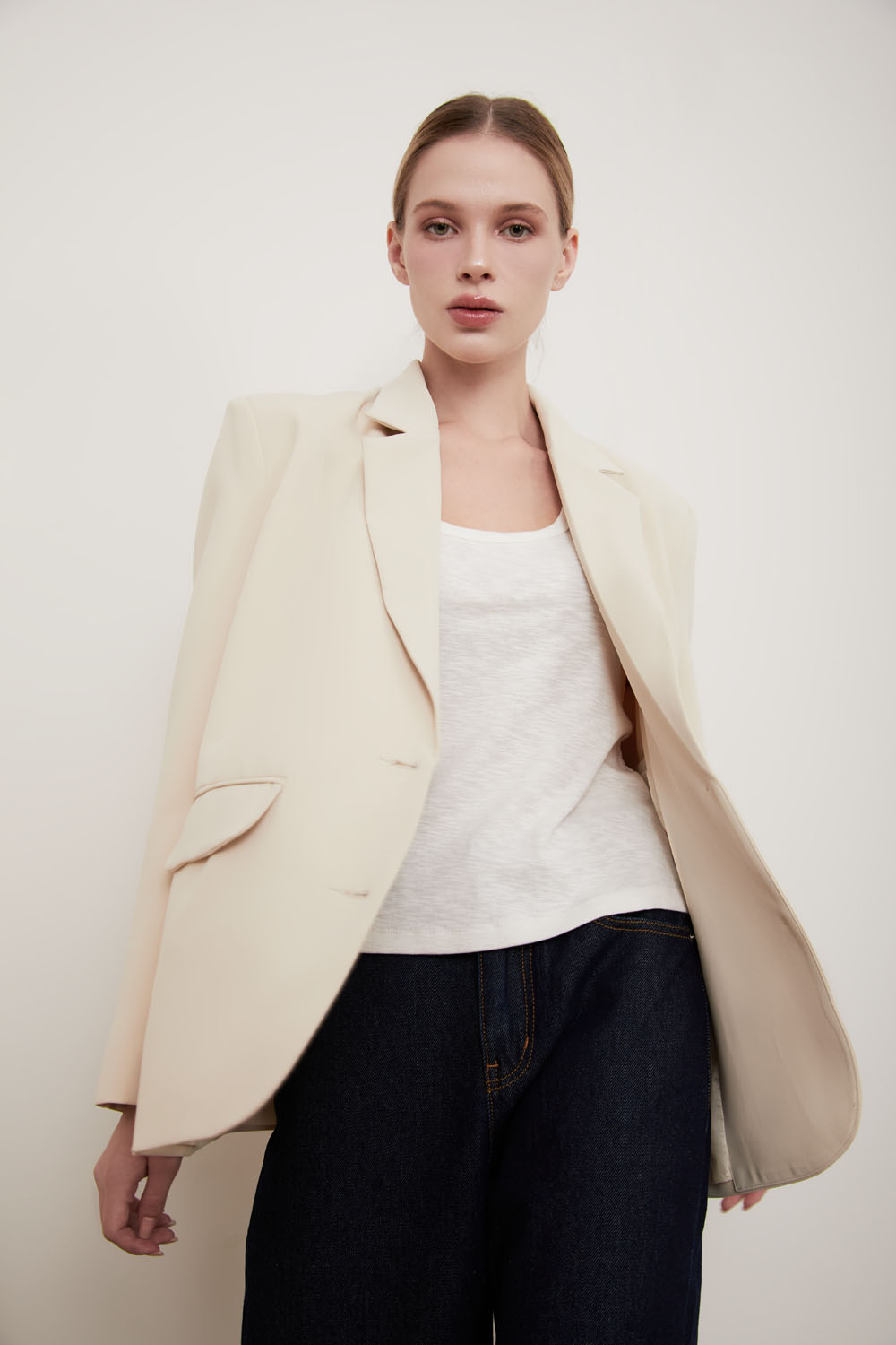 1. Thông tin sản phẩm Áo blazer vai rộng, không cổ, cài 2 khuy, tay lỡ dài, có lơ vê. Mỗi lớp vải mềm mại của Vincent Set là sự kết hợp hoàn hảo giữa