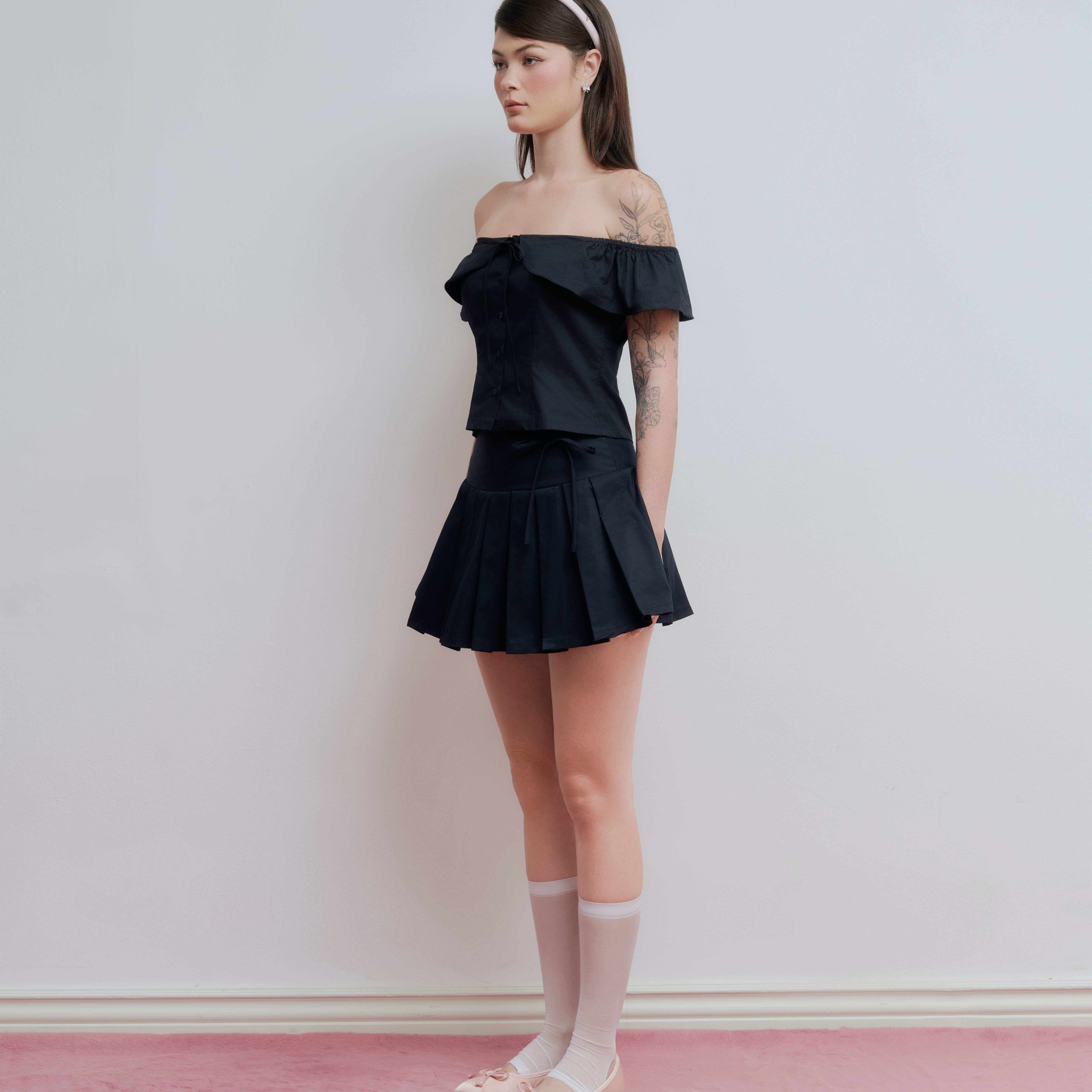 CHI TIẾT SẢN PHẨM - Sản phẩm : Chân váy xếp ly nhỏ dáng xòe cạp cao viền ren cột nơ trước Mora Miều Est.2013 - Chất liệu : Kaki - Màu sắc : ĐEN