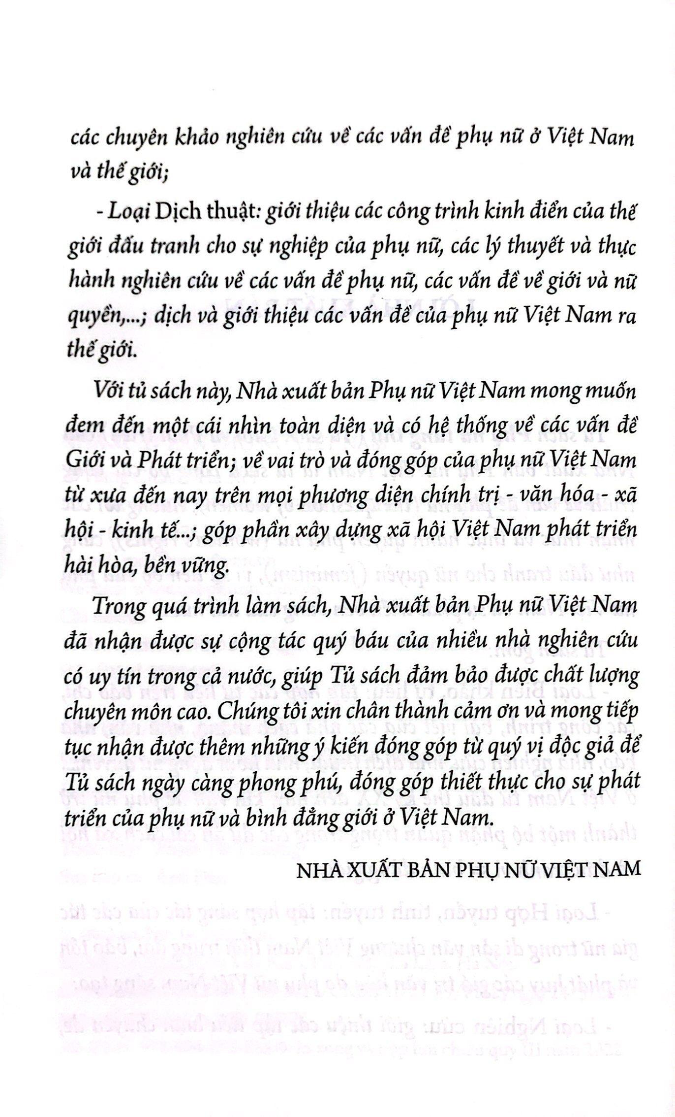 Với tủ sách này, Nhà xuất bản Phụ nữ mong muốn đem đến một cái nhìn toàn diện và có hệ thống về các vấn đề Giới và Phát triển; về vai trò và đóng góp của phụ nữ Việt Nam từ xưa đến nay trên mọi phương diện chính trị - văn hóa - xã hội - kinh tế; góp phần xây dựng xã hội Việt Nam phát triển hài hòa, bền vững.