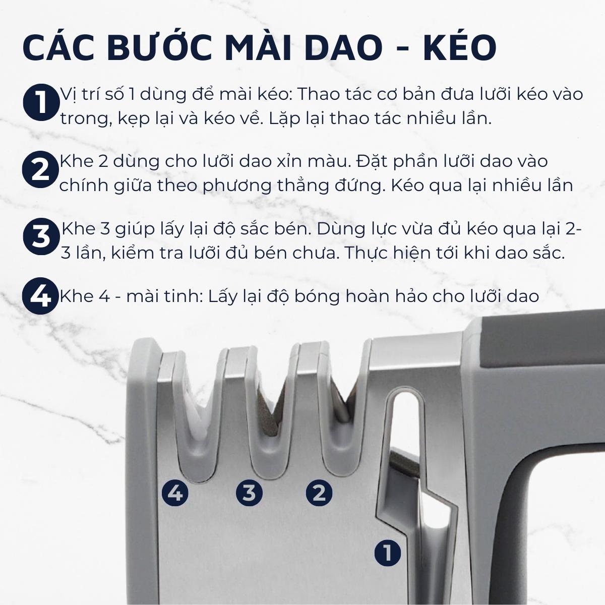 Chỉ với 1 dụng cụ đa năng thông minh, vừa có thể mài các loại dao như: dao đa năng, dao thái thịt, dao gọt củ quả, dao chặ Và còn được bổ sung thêm khe mài kéo tiện dụng.