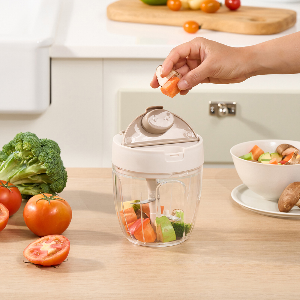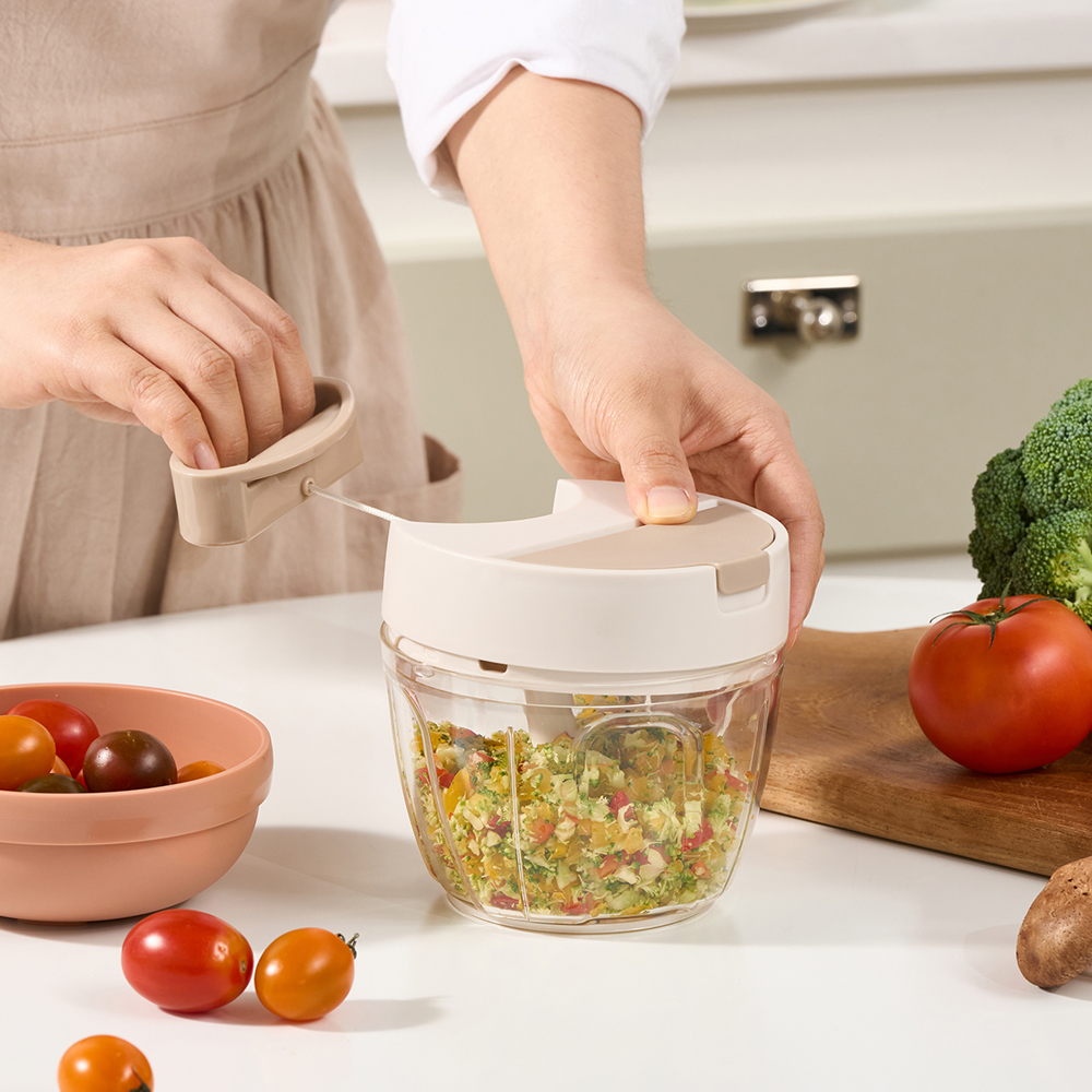Cắt, xay nhuyễn đối với các loại hành tỏi, ớt , rau, thảo mộc, hành tây, các loại hạt...bằng tay chỉ với thao tác kéo dây cắt cực dễ và tiện Các mẹ làm đồ