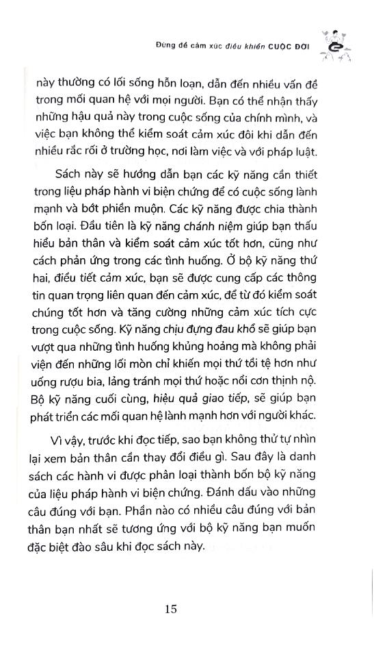 Đừng Để Cảm Xúc Điều Khiển Cuộc Đời là sách bài tập hỗ trợ các bạn trẻ tuổi teen khi rơi vào tình huống này. Bạn đọc sẽ tìm thấy trong sách những cách kiểm soát cảm xúc, giúp bạn sẵn sàng đương đầu với mọi “quả chanh” cuộc đời ném vào m.ình. Dựa trên liệu pháp hành vi biện chứng, một phương pháp trị liệu được thiết kế nhằm hỗ trợ những người gặp khó khăn trong việc xử lý những cảm xúc mãnh liệt, sách sẽ hướng dẫn bạn các kỹ năng cần thiết để vượt qua những thăng trầm trong đời với sự tự tin và duyên dáng.