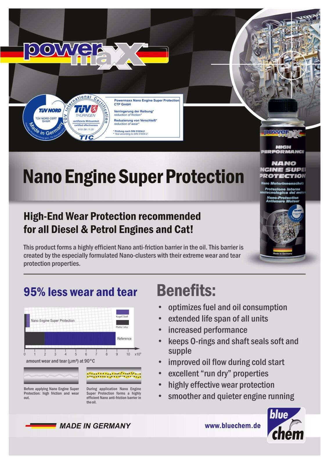 Dung dịch nano bảo vệ động xe cơ ô tô Bluechem BC33181E có tác dụng tạo một lớp lót trong lòng động cơ. Sản phẩm giống như 1 lớp phin mỏng bao phủ lấy bề mặt kim loại của toàn bộ lòng động cơ xe bao gồm ống xylanh, vòng piston, trục khủy và bánh răng.