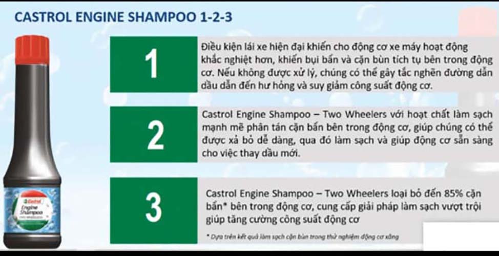 Mua tại TiktokĐiều kiện lái xe hiện đại khiến động cơ xe máy làm việc khắc nghiệt hơn, hình thành bụi bẩn và cặn bùn tích tụ bên trong động cơ. Nếu không được loại bỏ hoàn toàn khi thay dầu động cơ, các cặn bẩn này gây ảnh hưởng trực tiếp đến hoạt động của động cơ. Castrol Engine Shampoo - Two Wheelers là giải pháp súc rửa động cơ trước khi thay dầu, loại bỏ đến 85% cặn bẩn* bên trong động cơ, giúp làm sạch động cơ hiệu quả. Lợi điểm Làm sạch vượt trội giúp tăng cường công suất động cơ. Hướng dẫn sử dụng: Chuẩn bị: