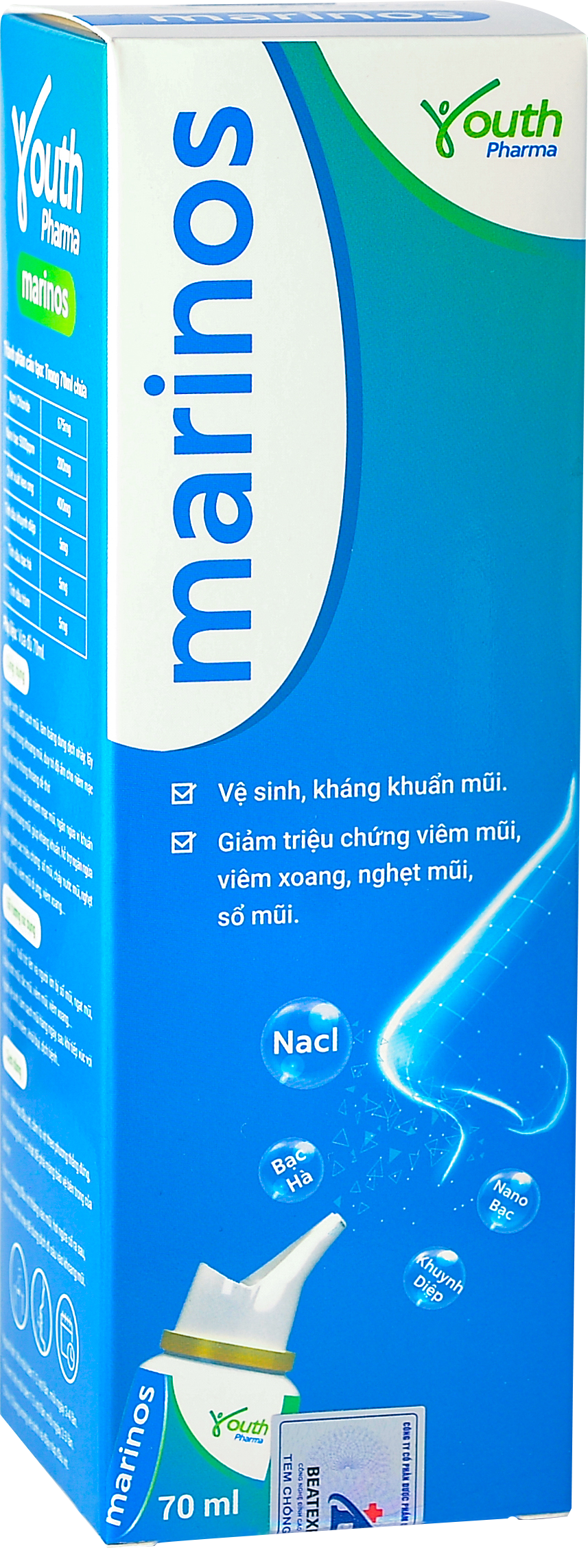 Xịt Mũi Marinos Youth Pharma 1. Công dụng: - Giúp mũi thông thoáng, dễ thở Hỗ trợ quá trình tái tạo niêm mạc mũi. - Ngăn ngừa vi khuẩn xâm nhập khoang mũi, giúp kháng