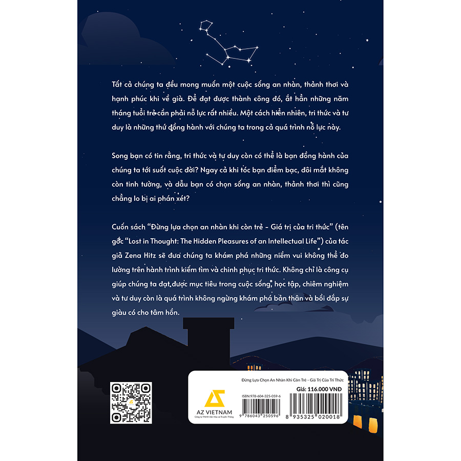 Cuốn sách ĐỪNG LỰA CHỌN AN NHÀN KHI CÒN TRẺ - GIÁ TRỊ CỦA TRI THỨC (tên gốc “Lost in Thought: The Hidden Pleasures of an Intellectual Life”) của tác giả Zena Hitz sẽ đưa chúng ta khám phá những niềm vui không thể đo lường trên hành trình kiếm tìm và chinh phục tri thức. Không chỉ là công cụ giúp chúng ta đạt được mục tiêu trong cuộc sống, việc học tập, chiêm nghiệm và tư duy còn là quá trình không ngừng khám phá bản thân và bồi đắp sự giàu có cho tâm hồn