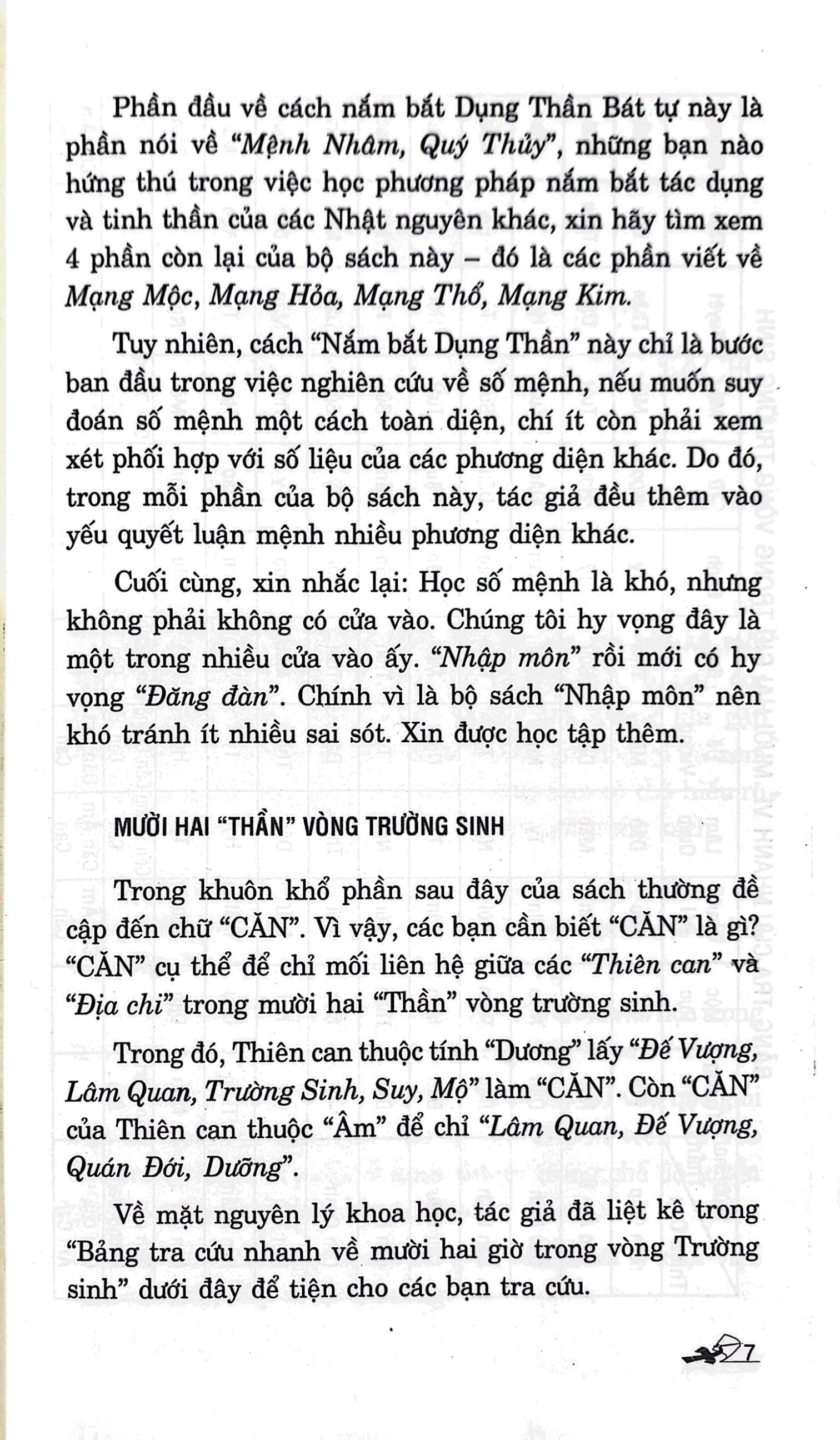 Nghiên cứu về số mệnh học, khó nhất là thuật Dụng Thần. Điểm sâu sắc trong nghệ thuật nắm bắt Dụng Thần của Ngũ hành chính là sự biến hóa vô lường, cho nên dù có đọc qua một số tài liệu tham khảo chuyên ngành về phương pháp này nhưng nhiều người vẫn chưa nắm bắt được điểm mấu chốt vì không dựa theo hệ thống chuyên luận mà tác giả sẽ trình bày đầy đủ bằng cách chia hệ thống này thành 5 thành phần “Mạng Mộc, Mạng Hỏa, Mạng Thổ, Mạng Kim, Mạng Thủy” nhằm giải thích một cách cặn kẽ và đơn giản từng Nhật Nguyên (tức 10 Nhật can phối hợp với 12 Nguyệt Lệnh địa chi).