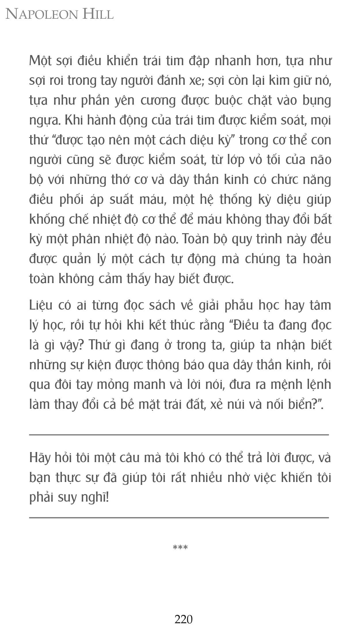 Trăn trở này cũng đã từng lóe lên trong đầu Napoleon Hill khi ông còn là một cậu thiếu niên. Nó đã ngự trị trong tâm trí ông một thời gian rất dài. Có lẽ cũng vì vậy mà Napoleon Hill đã dành cả đời mình để theo đuổi và tìm đáp án cho câu hỏi ấy. Kết quả là, ông không những đã đi được đến tận cùng của vấn đề, mà bản thân ông còn trở thành một người có sức ảnh hưởng sâu sắc và mạnh mẽ nhất trong lĩnh vực truyền cảm hứng thành công trong lịch sử thế giới. Ông nói: “Chúng ta không thất bại khi cố gắng thực hiện nhiệm vụ của mình, chúng ta chỉ thất bại khi xao nhãng nhiệm vụ đó”.