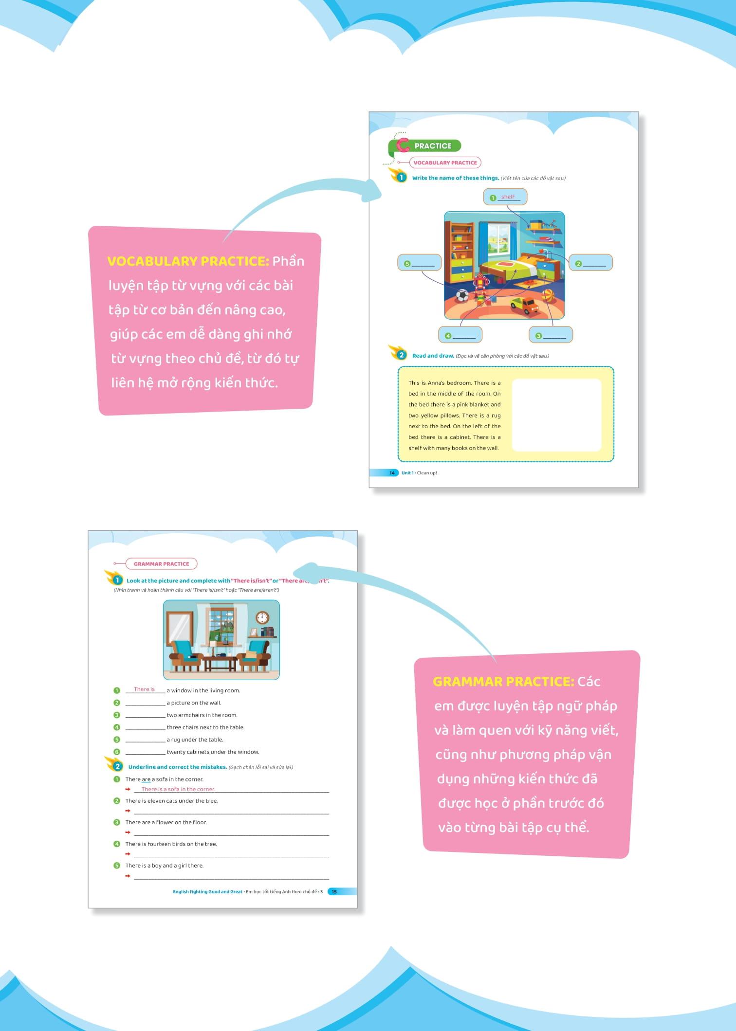 • Các phần lý thuyết và bài tập vận dụng đưa các em tiếp cận đầy đủ các kỹ năng: nghe, nói, đọc, viết, từ đó tạo dựng nền tảng tiếng Anh vững chắc.