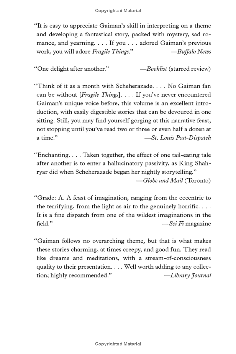 With breathtaking clarity, Fragile Things illumines Gaiman’s brilliance as well as his terrifyingly entertaining dark sense of humor. By turns delightful, disturbing, and diverting, this volume is a gift of enchantments that will startle the senses and stir the soul.