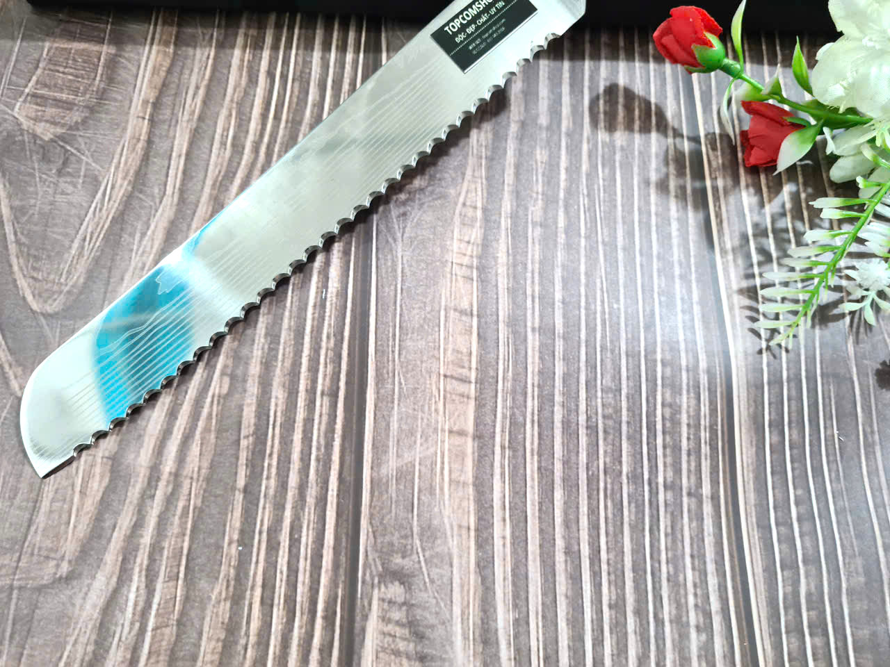DAO BẾP SASHIMI MẶT HOA VĂN MÃ N4 THÔNG TIN SẢN PHẨM TỔNG DÀI : 45cm, LƯỠI: 30cm,RỘNG : 4cm, dày: 2.5mm, CHẤT liệu lưỡi: thép IFA cao cấp Chất liệu CÁN: gỗ Cẩm chỉ,