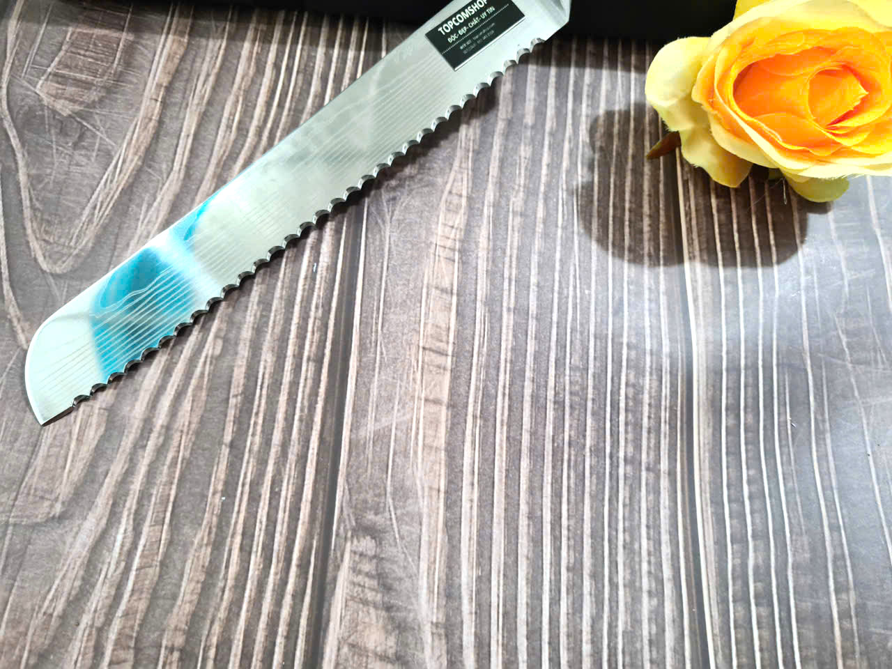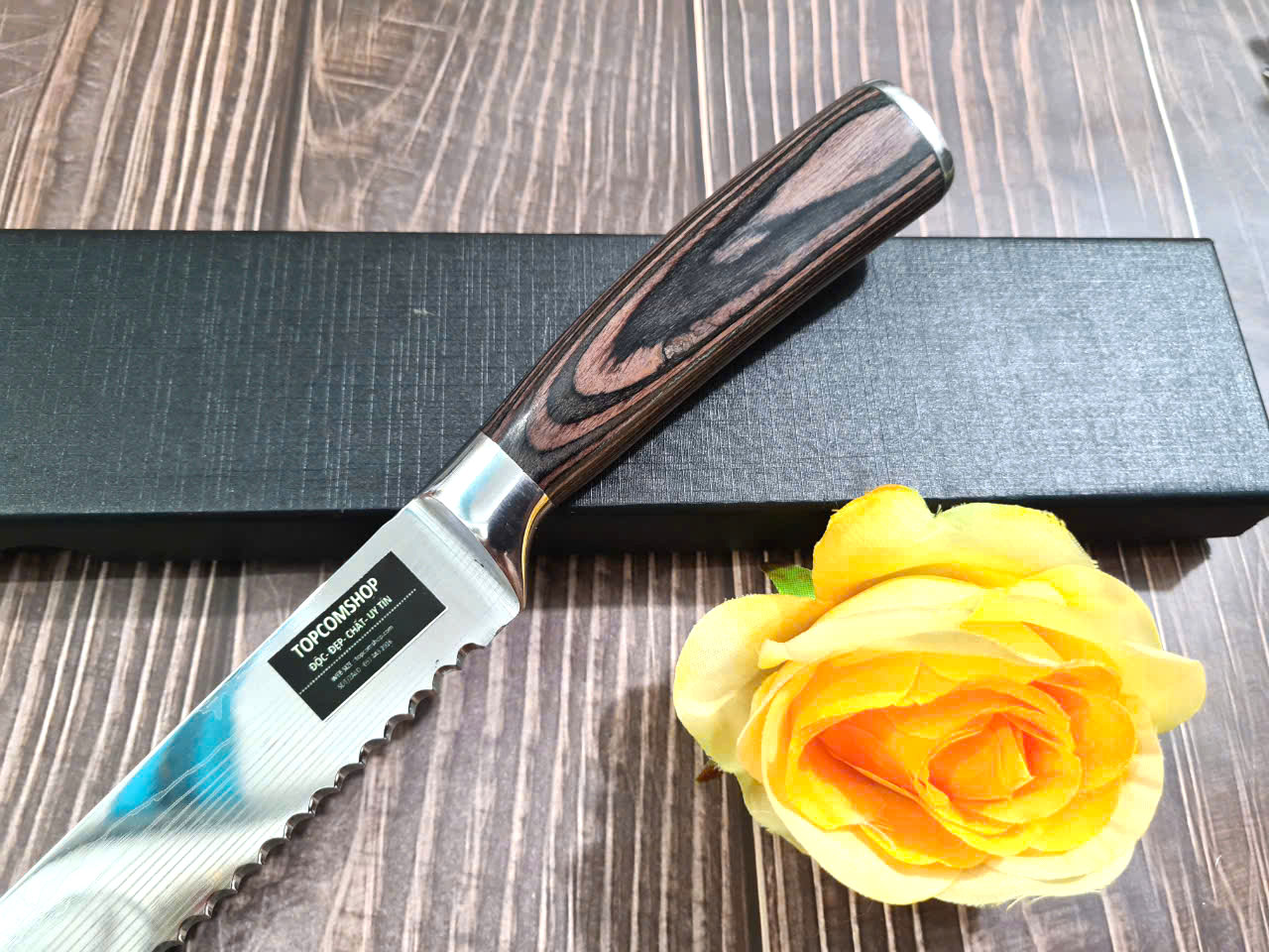 DAO BẾP SASHIMI MẶT HOA VĂN MÃ N4 THÔNG TIN SẢN PHẨM TỔNG DÀI : 45cm, LƯỠI: 30cm,RỘNG : 4cm, dày: 2.5mm, CHẤT liệu lưỡi: thép IFA cao cấp Chất liệu CÁN: gỗ Cẩm chỉ,