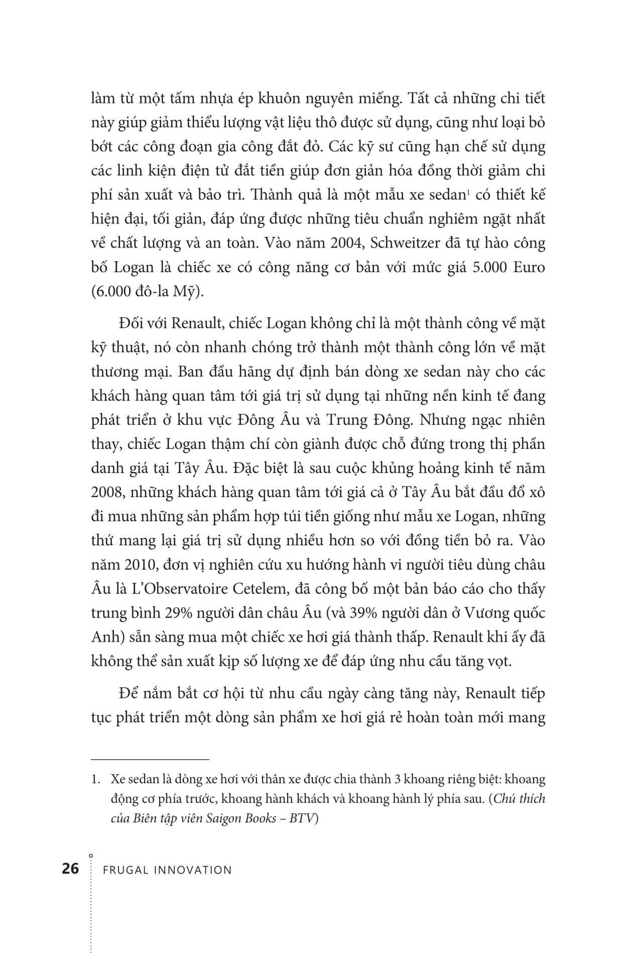 Cuốn sách Frugal Innovation – Làm Tốt Hơn Với Nguồn Lực Ít Hơn cung cấp những chỉ dẫn cần thiết để doanh nghiệp tiếp cận phương pháp đổi mới sáng tạo tiết kiệm đúng cách. Khi mà sự trỗi dậy của chủ nghĩa tiêu dùng từng xảy ra trong thế kỷ 20 nay không còn nữa. Cách sống cần kiệm, khát vọng, tính cá nhân hóa và những giới hạn của tự nhiên đều đòi hỏi chúng ta thì Frugal Innovation: How to do better with less lại ra đời đúng thời điểm. Tác giả Radjou và Prabhu đã vẽ ra một bức tranh sống động về cách thức doanh nghiệp có thể pha trộn các giá trị và chất lượng để mang lại sự cân bằng cá nhân và xã hội mà những người tiêu dùng của thế kỷ 21 mong muốn.