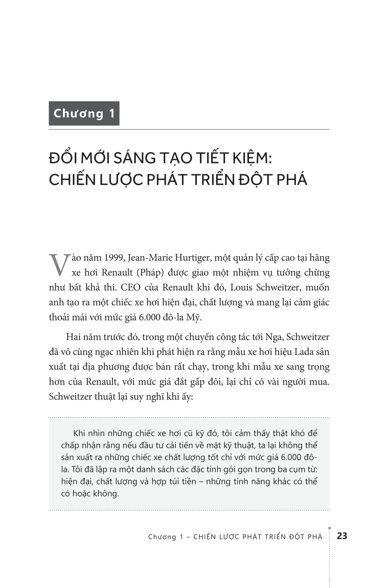 Chương 1: Đổi mới sáng tạo tiết kiết kiệm: chiến lược phát triển đột phá, phần này tác giả cho chúng ta thấy các đặc tính độc đáo của đổi mới sáng tạo tiết kiệm là gì? Và tại sao đổi mới sáng tạo tiết kiệm lại trở thành một vấn đề mang tính cấp thiết hàng đầu với đội ngũ quản lý ngày nay, đồng thời đi vào tìm hiểu chi tiết hơn về câu hỏi “làm thế nào” để đổi mới sáng tạo tiết kiệm.