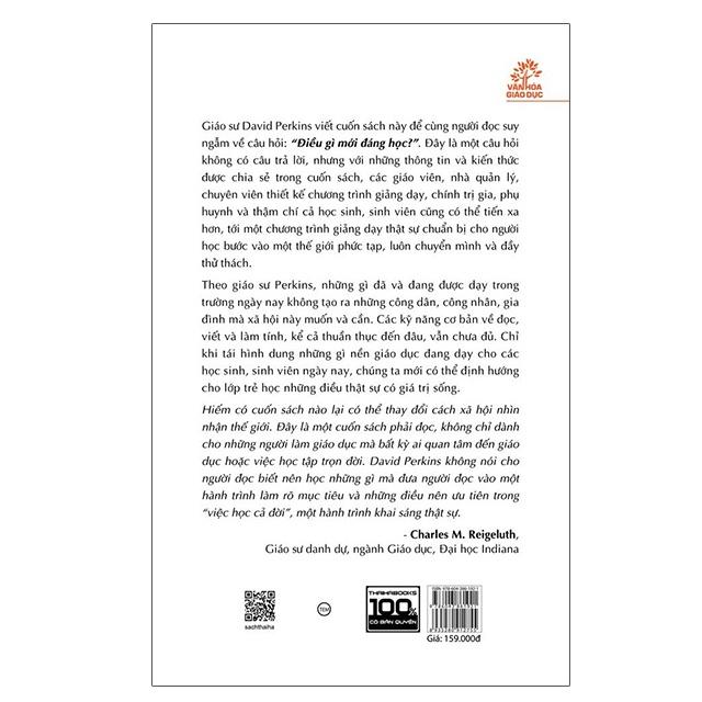 Xuyên suốt cuốn sách này, giáo sư Perkins giải thích các khái niệm chính, tiêu chí chương trình giảng dạy và kỹ thuật ưu tiên, để giáo viên có thể hướng học sinh đến những kiến thức quan trọng. Bằng cách tái hình dung chương trình giảng dạy, giáo viên có thể truyền đạt nhiều hơn cả các kỹ năng cơ bản, cũng như trau dồi tư duy phản biện và sáng tạo, các kỹ năng hợp tác, lãnh đạo và khởi nghiệp có giá trị sống và phát triển trong bất kỳ thời đại nào. Với trọng tâm mới, các nhà giáo dục có thể khuyến khích người học không chỉ nắm vững lý thuyết mà còn có thể liên kết chúng với các tình huống cuộc sống, giúp người học hiểu sâu hơn và hành động có ích hơn.
