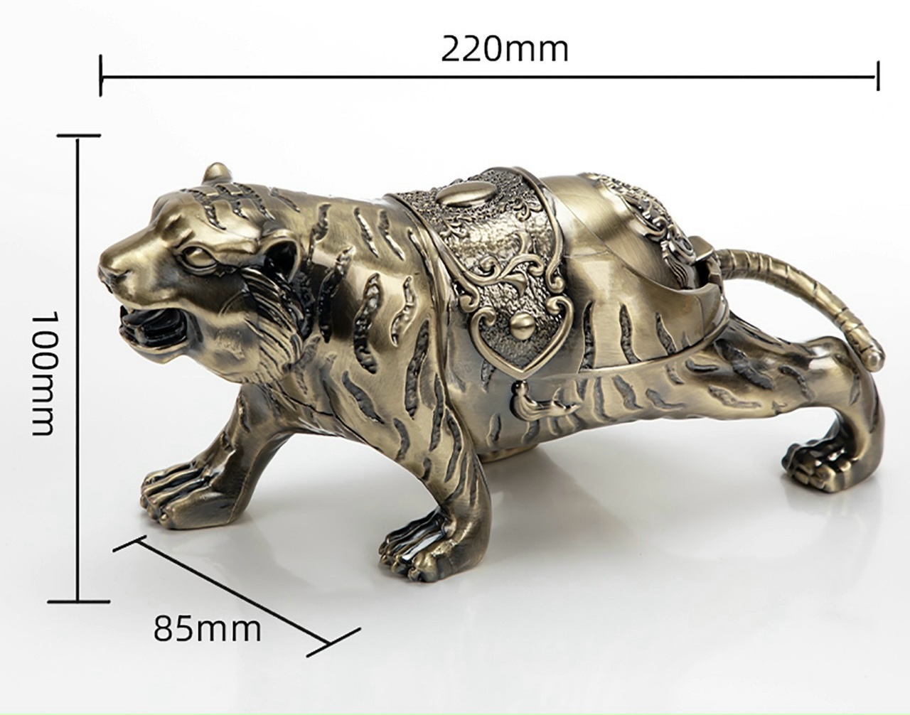 Mua tại TiktokChất liệu: hợp kim đồng Kich thước: Dài 24cm x Cao 11cm Trọng lượng: 450g Thiết kế tinh xảo, bắt mắt, bền màu, và rất sang trọng đặc biệt chuẩn bị cho năm Hổ sắp tới. Nắp đóng mở dễ vệ sinh, lau chùi. Dùng để gạt tàn trong gia đình, nhà hàng ,khách sạn, quán ba vv.