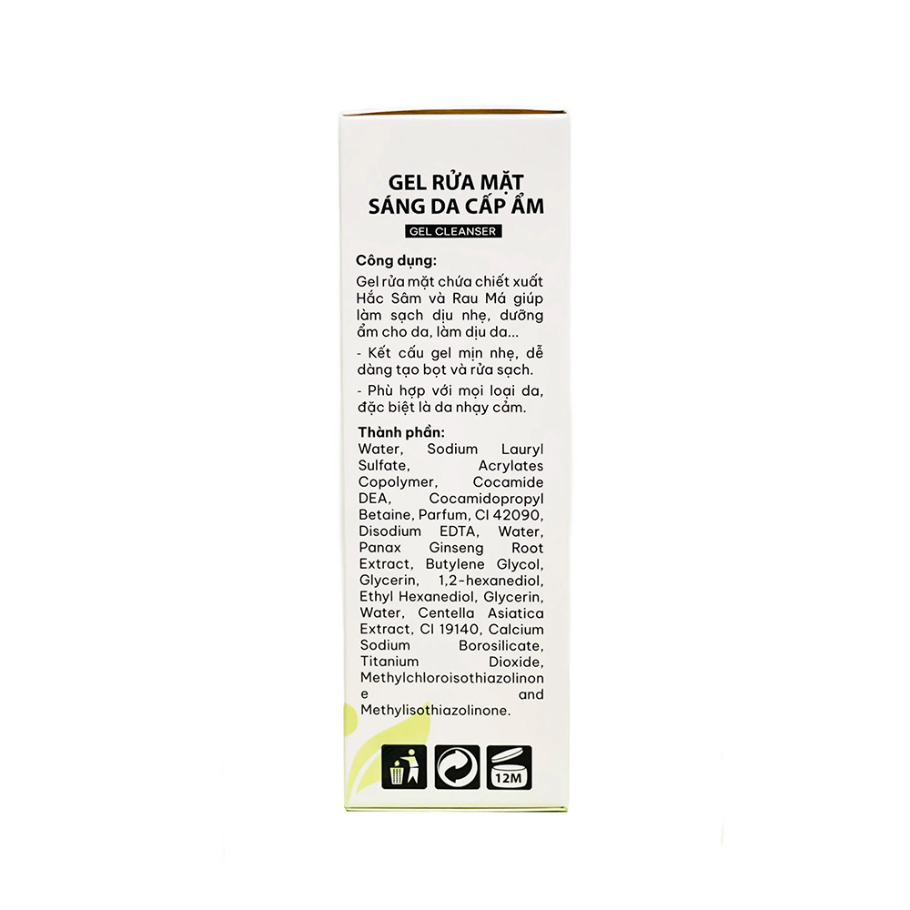 Công dụng: Gel rửa mặt chứa chiết xuất Hắc Sâm và Rau Má giúp làm sạch dịu nhẹ, dưỡng ẩm cho da, làm dịu da... Kết cấu gel mịn nhẹ, dễ dàng tạo bọt và rửa sạch. Phù hợp với mọi loại da, đặc biệt là da nhạy cảm. Thành phần: Water, Sodium Lauryl Sulfate, Acrylates Copolymer, Cocamide DEA, Cocamidopropyl Betaine, Parfum, CI 42090, Disodium EDTA, Water, Panax Ginseng Root Extract, Butylene Glycol, Glycerin, 1,2-hexanediol, Ethyl Hexanediol, Glycerin, Water, Centella Asiatica Extract, CI 19140, Calcium Sodium Borosilicate, Titanium Dioxide, Methylchloroisothiazolinone and Methylisothiazolinone. Hướng dẫn sử dụng: Lấy một lượng vừa đủ, tạo bọt với nước, thoa đều và massage nhẹ nhàng. Rửa sạch lại với nước. Điều kiện bảo quản: