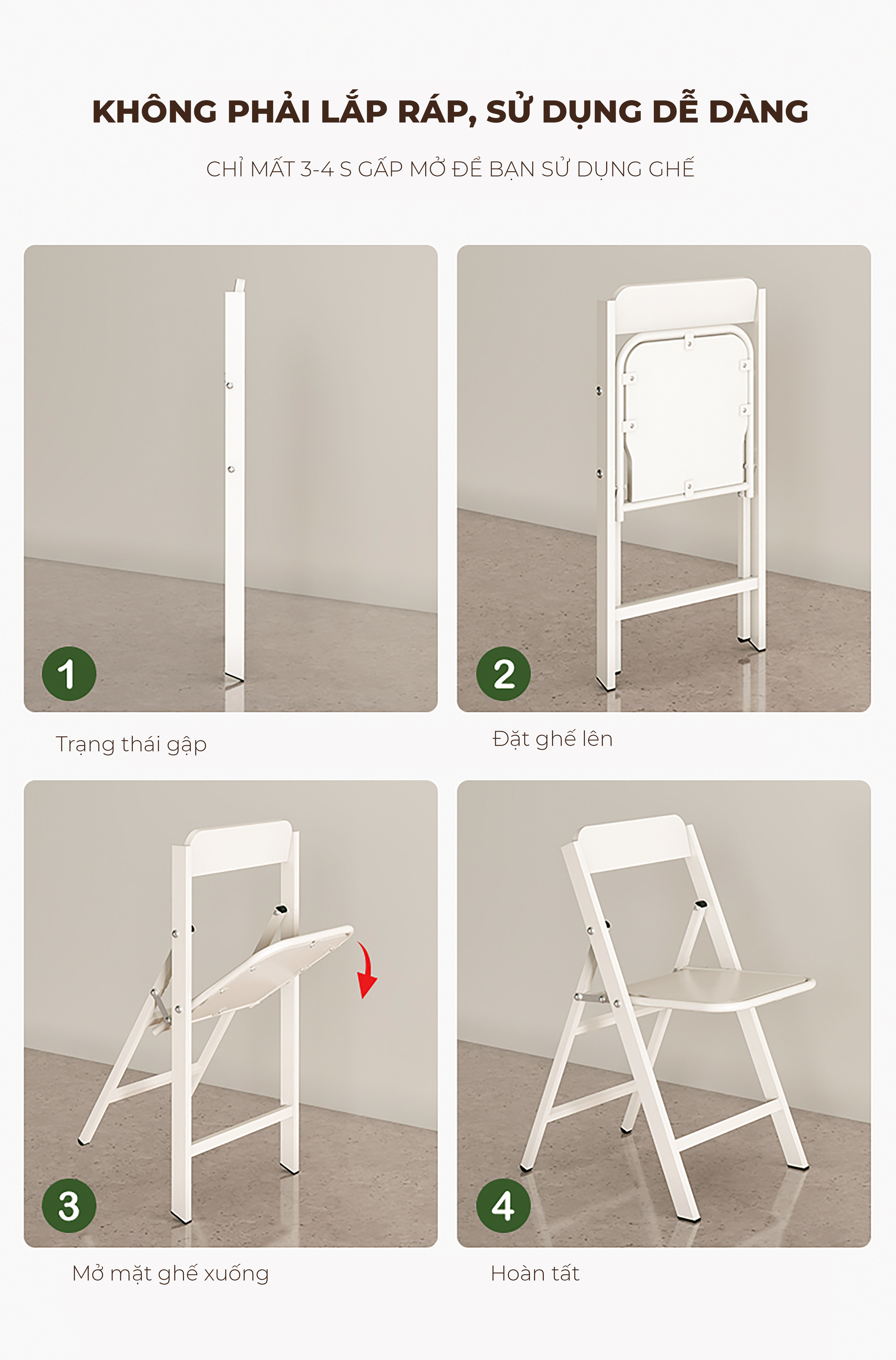 Công năng: Là mẫu ghế gấp gọn thông minh phù hợp làm ghế bàn ăn, ghế bàn trà, ghế cafe...