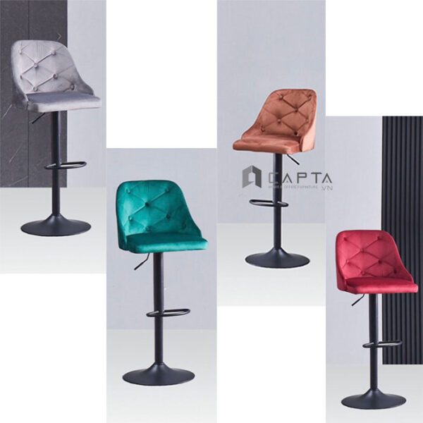 Ghế quầy bar nhập khẩu rẻ đẹp Chất liệu: chân sơn tĩnh điện màu đen, nệm bọc vải nhung Màu sắc: Xám, xanh, nâu, đỏ Ghế bar nệm vải nhung có lưng tựa sang trọng