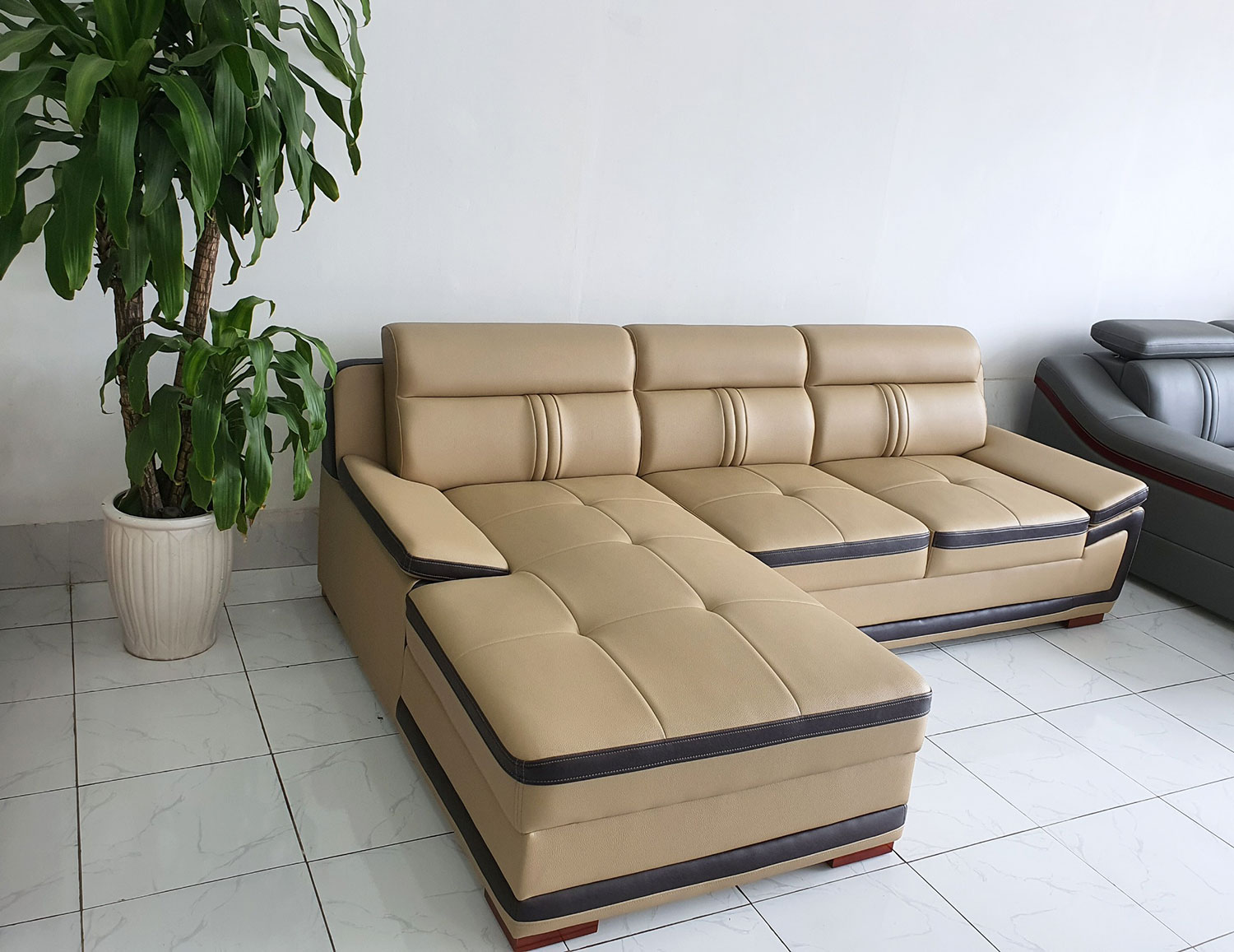 Có được một bộ ghế đẹp cho phòng khách là điều ai cũng mong muốn. Để đáp ứng nhu cầu của khách hàng chúng tôi đã cho ra đời bộ sofa với thiết kế mới nhất, mang đậm hiện đại, đẹp mắt. Bộ sofa này màu kem có viền màu nâu đen, lưng ghế có 2 đường may ở giữa chạy dọc tạo điểm nhấn, mặt ngồi của ghế được may rút nút nên khi nằm sẽ đỡ bị nóng hơn. Ghế sofa da công nghiệp cao cấp được thiết kế đơn giản theo góc nhà tạo thành hình chữ L giúp tiết kiệm diện tích và tận dụng được các góc chết của căn phòng. Tiện lợi cho cả việc tiếp khách lẫn thư giãn, đọc sách, xem phim,