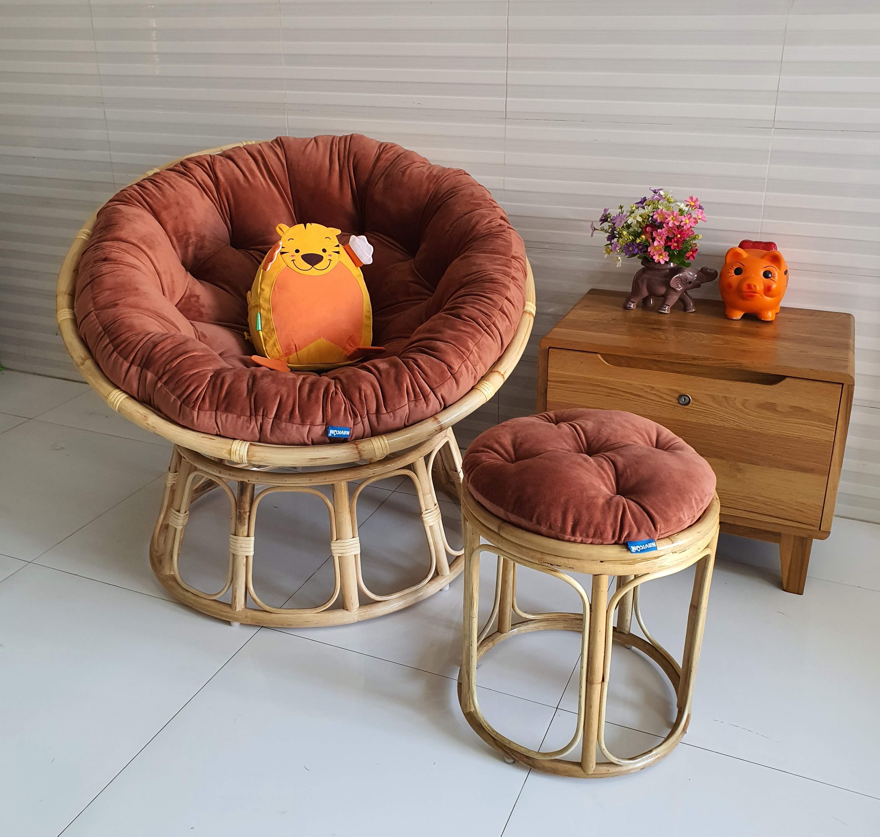 - Kích Thước : D 1m x cao 74cm - Chất liệu : + khung : mây song mật + nệm : gòn bi xuất khẩu bọc vải nhung Ghế thư giãn papasan phù hợp