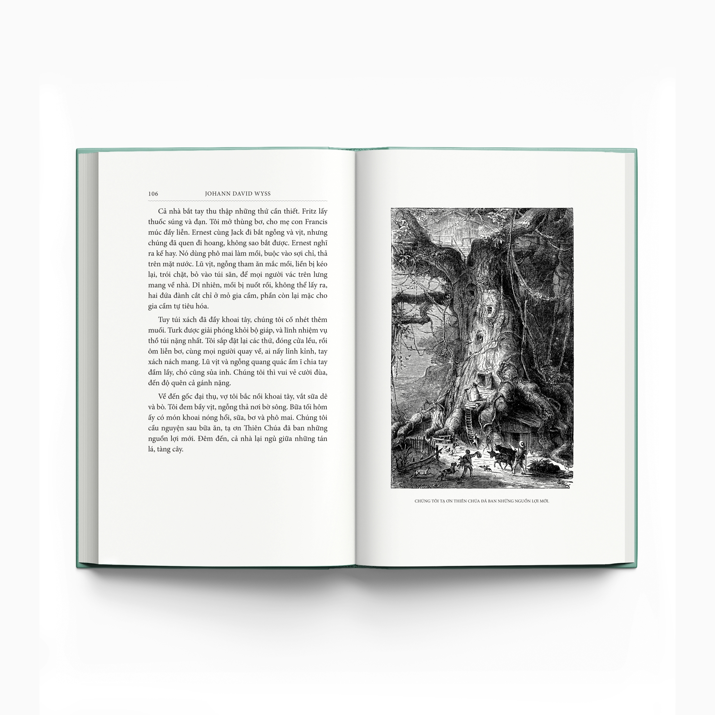 Ấn bản này bổ sung minh họa từ cuốn Le Robinson Suisse ou Histoire d’une famille Suisse naufragée, do Théodore Lefèvre phát hành năm 1877. Sách bìa cứng, bìa bọc bằng vải. Bụng sách được nhũ vàng.