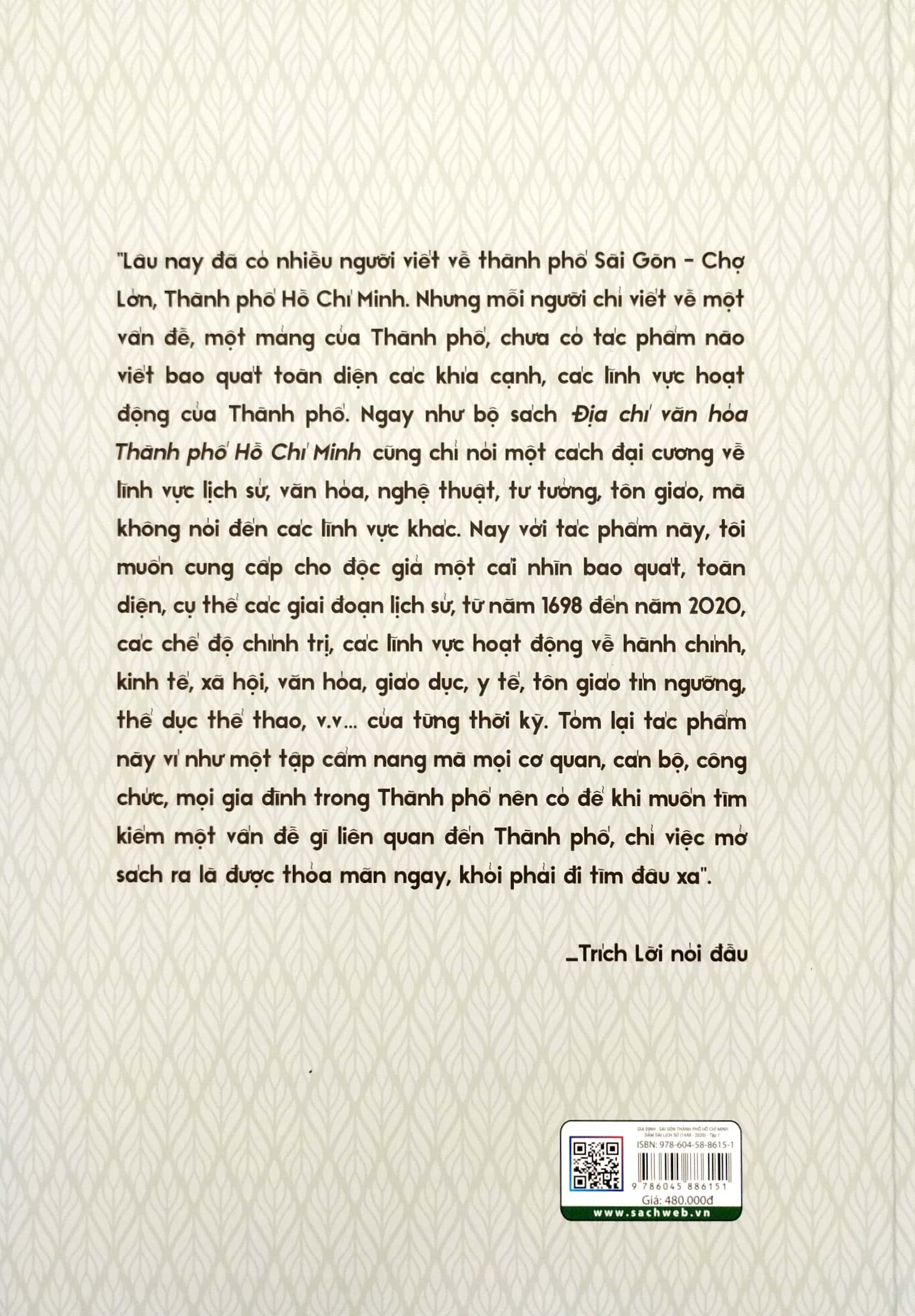 "Lâu nay đã có nhiều người viết về thành phố Sài Gòn - Chợ Lớn, Thành phố Hồ Chí Minh. Nhưng mỗi người chỉ viết về một vấn đề, một mảng của Thành phố, chưa có tác phẩm nào viết bao quát toàn diện các khía cạnh, các lĩnh vực hoạt động của Thành phố. Ngay như bộ sách Địa chỉ văn hóa Thành phố Hồ Chí Minh cũng chỉ nói một cách đại cương về lĩnh vực lịch sử, văn hóa, nghệ thuật, tư tưởng, tôn giáo, mà không nói đến các lĩnh vực khác. Nay với tác phẩm này, tôi muốn cung cấp cho độc giả một cái nhìn bao quát, toàn diện, cụ thể các giai đoạn lịch sử, từ năm 1698 đến năm 2020, các chế độ chính trị, các lĩnh vực hoạt động về hành chính, kinh tế, xã hội, văn hóa, giáo dục, y tế, tôn giao fin ngưỡng, thể dục thể thao, của từng thời kỳ. Tóm lại tác phẩm này vi như một tập cẩm nang mà mọi cơ quan, can bộ, công chức, mọi gia đình trong Thành phố nên có để khi muốn fim kiếm một vấn đề gì liên quan đến Thành phố, chỉ việc mở sách ra là được thỏa mãn ngay, khỏi phải đi tìm đâu xa".