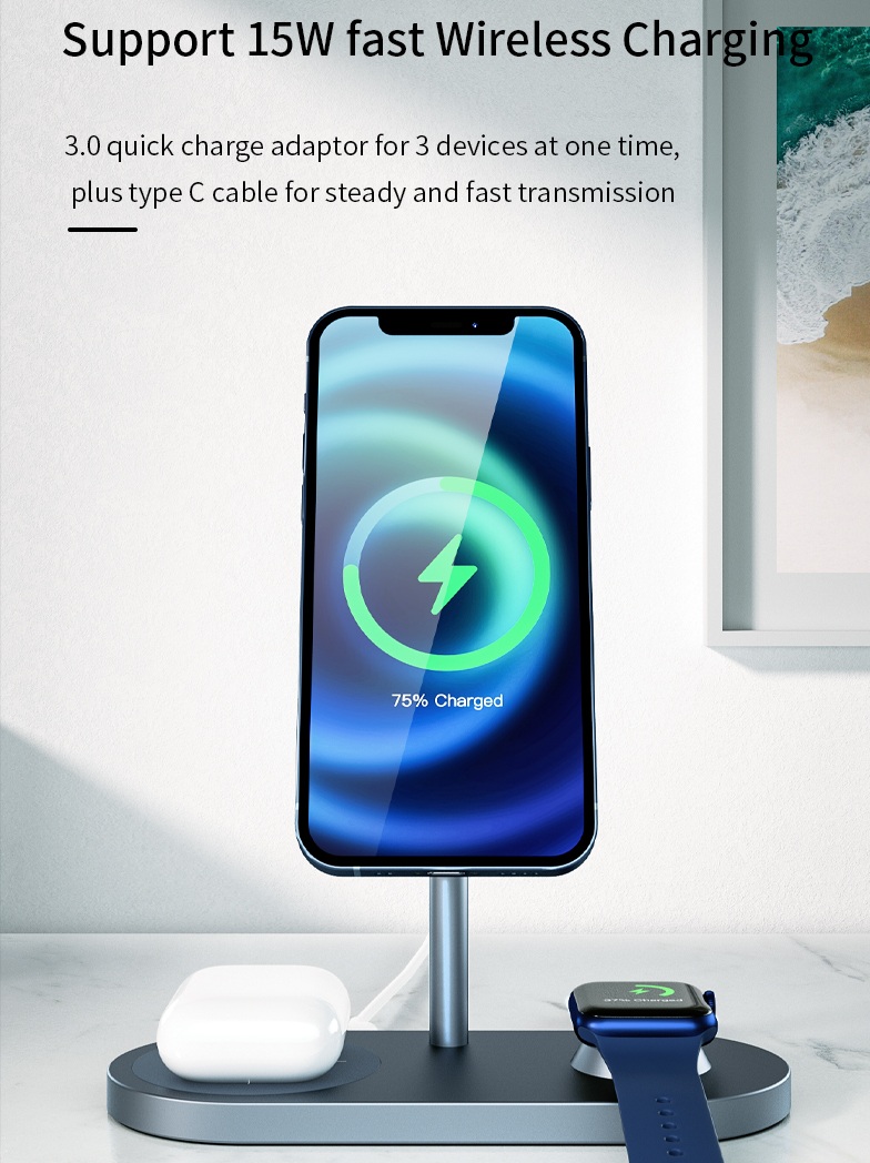 Đế sạc Wiwu Power Air X23 3 in 1 1. Thương hiệu: Wiwu 2. Mô tả sản phẩm - Hỗ trợ sạc nhanh không dây 15W, bộ chuyển đổi sạc nhanh 3.0 cho 3 thiết