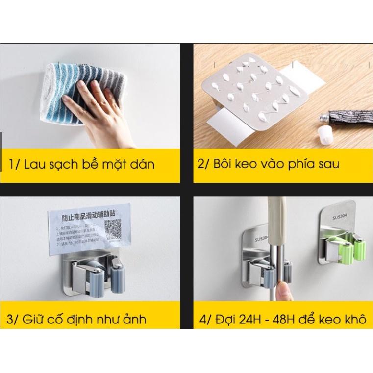 - Kẹp giữ cây lau nhà không cần phải khoan tường gắn đinh, dán móc bằng keo 2 mặt, khả năng chịu lực tốt đến 6 kg.