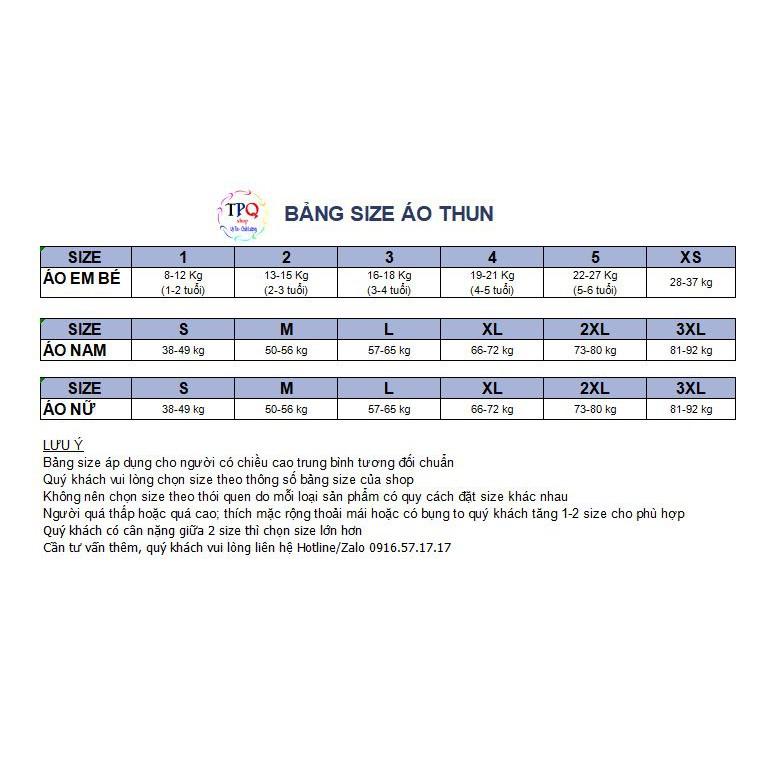 - Size áo : đủ size (từ 9kg-120kg). Quý khách chọn size theo bảng size của shop SIZE TRẺ EM
