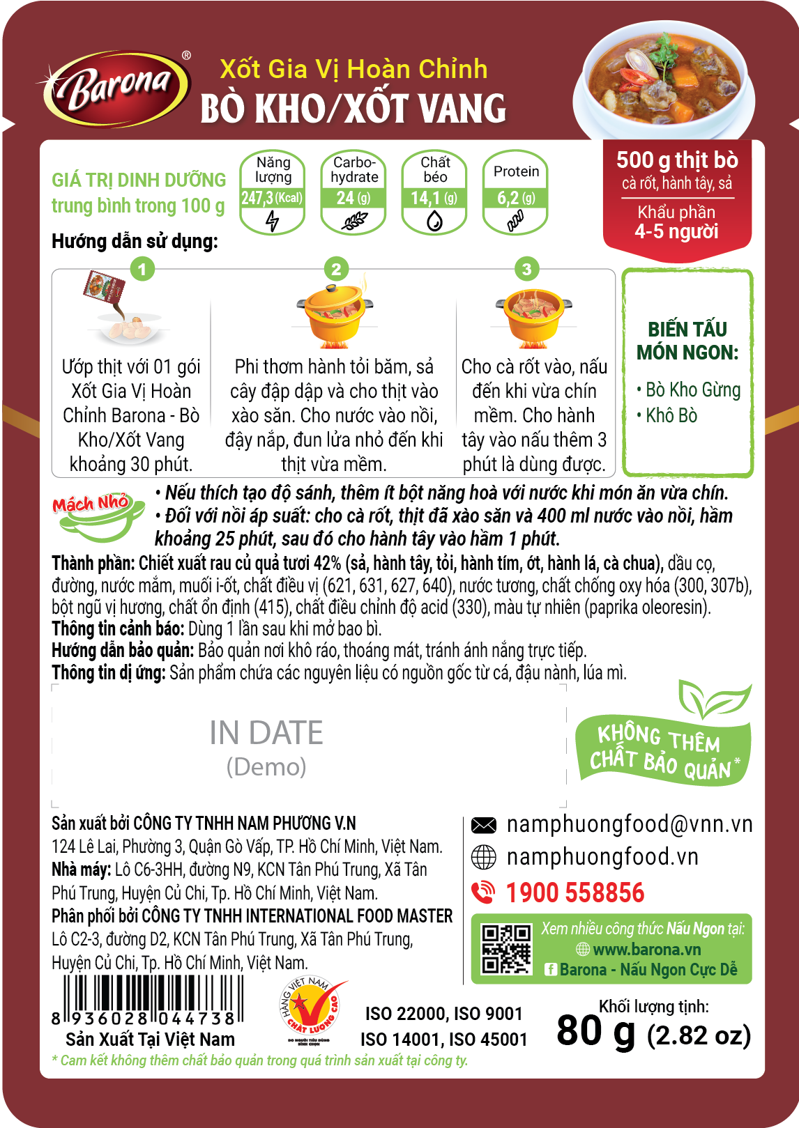 Mua tại TiktokGia Vị Bò Kho/ Xốt Vang Barona 80g ướp ngon chuẩn vị không cần nêm nếm Xốt Gia Vị Hoàn Chỉnh Barona là công thức phối trộn độc đáo giữa CHIẾT XUẤT RAU CỦ QUẢ TƯƠI như hành, tỏi, me, cà chua…cùng các loại gia vị truyền thống được chọn lọc, đem đến món ngon chuẩn vị chỉ trong tích tắc mà KHÔNG CẦN NÊM NẾM thêm bất kỳ gia vị nàokhác. Hạn sử dụng: 12 tháng Quy cách: 80g/ gói, 20 gói/ hộp , 4 hộp/ thùng *Hướng dẫn thực hiện: Bò kho/ Xốt Vang