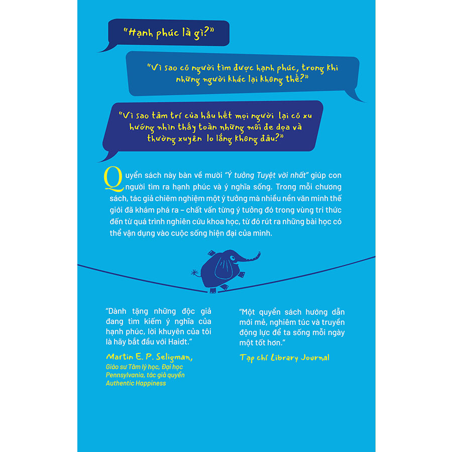 “Dành tặng những độc giả đang tìm kiếm ý nghĩa của hạnh phúc, lời khuyên của tôi là hãy bắt đầu với Haidt.” – Martin E. P. Seligman, Giáo sư Tâm lý học, Đại học Pennsylvania, tác giả quyển Authentic Happiness