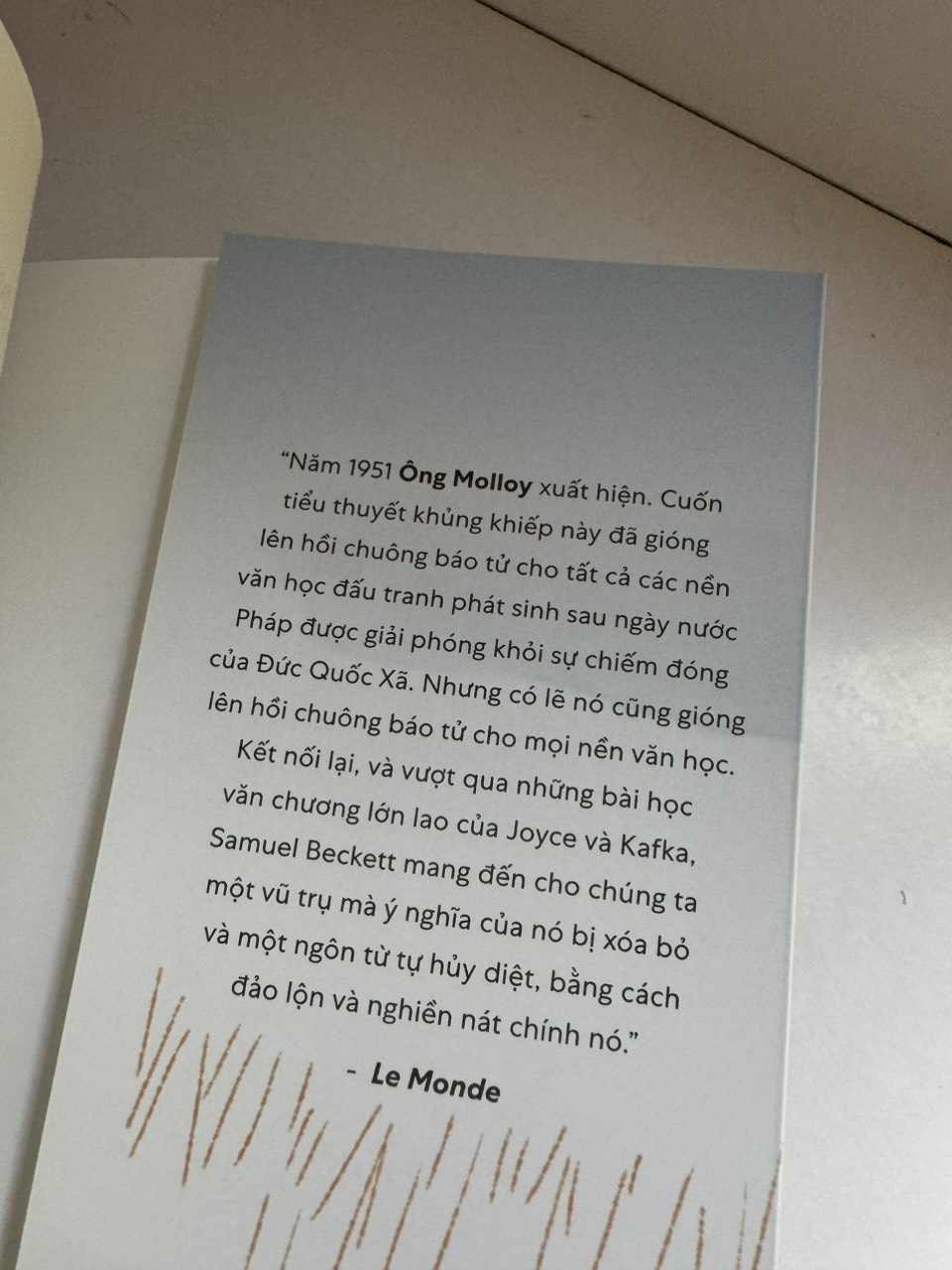"Phải, suốt đời tôi sống trong nỗi kinh hoàng về những vết thương nhiễm trùng, dù tôi là kẻ không bao giờ bị nhiễm trùng, vì người tôi đầy a xít. Đời tôi, đời tôi, tôi nói về nó, khi thì như một điều đã chấm dứt, khi thì như một trò đùa còn đang kéo dài, và tôi đã nhầm, bởi nó vừa đã chấm dứt lại vừa kéo dài, ta phải dùng động từ ở thể nào để diễn tả điều này? Người thợ đồng hồ đã lên hết dây cót và đã chôn cái đồng hồ, trước khi chết, để những bánh răng cưa cong queo của nó, một ngày nào đó, sẽ kể về Thượng Đế với những con côn trùng."