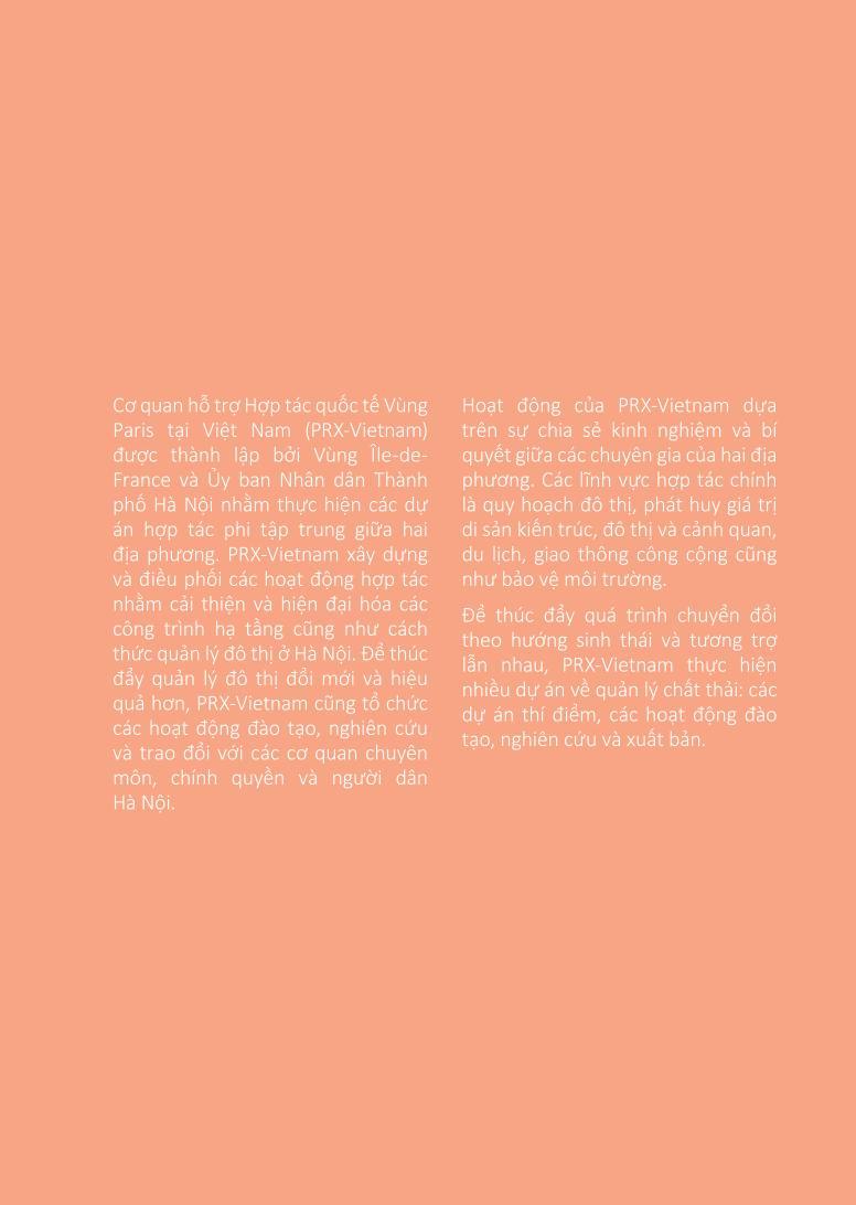 Ấn phẩm này được thực hiện trong khuôn khổ chương trình “Chất lượng cuộc sống - Chất lượng thành phố”, là kết quả hợp tác giữa Ủy ban nhân dân thành phố Hà Nội và Vùng Île-de-France, với sự hỗ trợ tài chính của Cơ quan Phát triển Pháp. Nhờ chương trình này, các đối tác hướng tới mục tiêu cải thiện chất lượng cuộc sống ở Hà Nội thông qua việc quan tâm tốt hơn đến các vấn đề môi trường của các cơ quan công quyền và người dân thành phố thông qua bốn dự án: phát triển đô thị bền vững, quản lý sinh thái không gian xanh, đo lường chất lượng không khí và giảm thiểu chất thải.