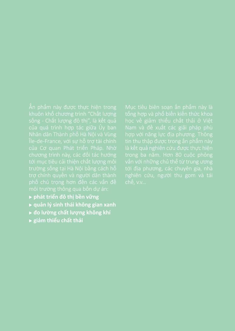 Mục tiêu của cuốn sách này là cải thiện việc sản xuất và phổ biến kiến thức khoa học về giảm thiểu chất thải ở Việt Nam và đề xuất các giải pháp phù hợp với kỹ năng của cộng đồng địa phương Việt Nam. Thông tin thu thập được trong ấn phẩm này là kết quả của công việc nghiên cứu được thực hiện trong ba năm. Hơn tám mươi cuộc phỏng vấn với các tác nhân chính đã được thực hiện: các tác nhân công ở cấp trung ương và địa phương, các nhà chuyên môn, nhà nghiên cứu, người thu gom, người tái chế,