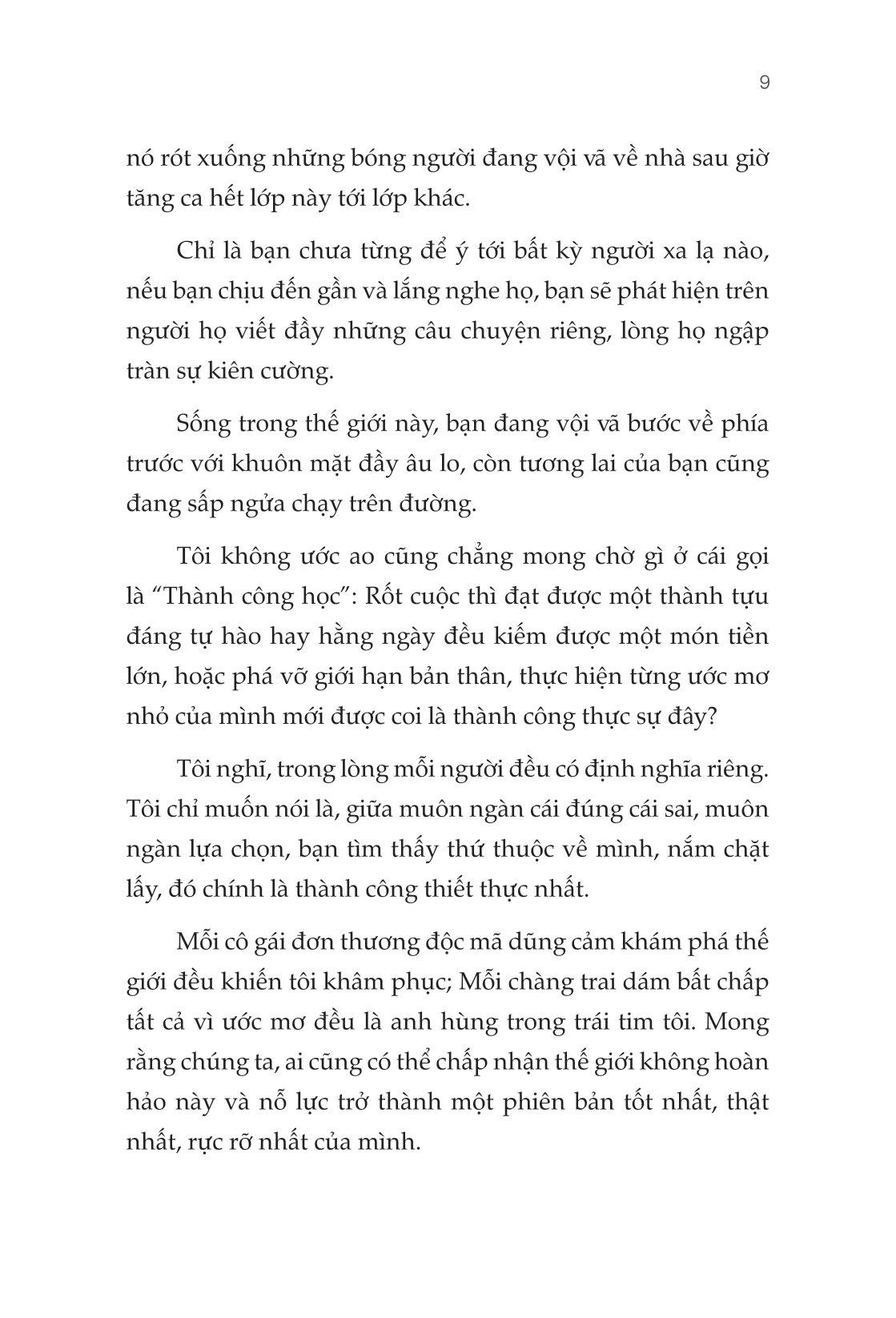 Sống trong thế giới này, bạn đang vội vã bước về phía trước với khuôn mặt đầy âu lo, còn tương lai của bạn cũng đang sấp ngửa chạy trên đường. Giữa muôn ngàn cái đúng cái sai, muôn ngàn lựa chọn, bạn tìm thấy thứ thuộc về m.ình, nắm chặt lấy, đó chính là thành công thiết thực nhất.